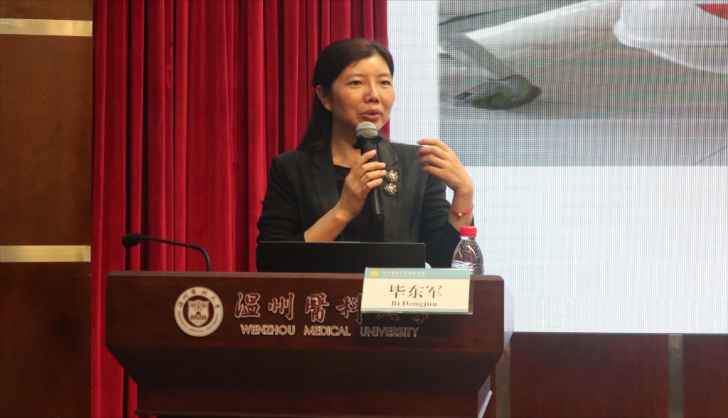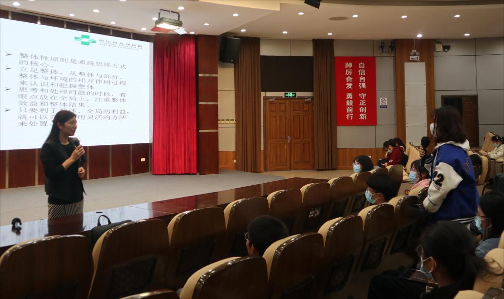 讲坛伊始,毕东军副经理为同学们介绍了台州恩泽医疗中心(集团)的组成与设置、使命与愿景,阐述了医疗中心始终秉持着的“十大信条”与精神文化。她围绕“何为有思想”“如何成为一个有思想的护理人”两大方面,展开了精彩的讲述。