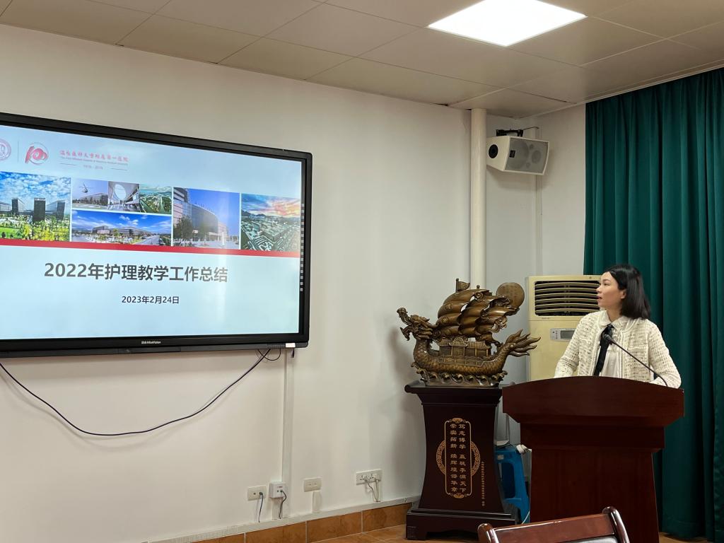 会上,附属一院护理部副主任张丽青从教学工作量、教学创新、教学成绩三部分回顾了过去一年的教学工作,提出今年将重点推进教学骨干教学能力提升、教学资源建设和课程建设。附属二院护理部副主任李育梅汇报了上一年度在护理教学方面取得的成果,提出今年将加速护理教学团队队伍建设,提升临床教学质量。