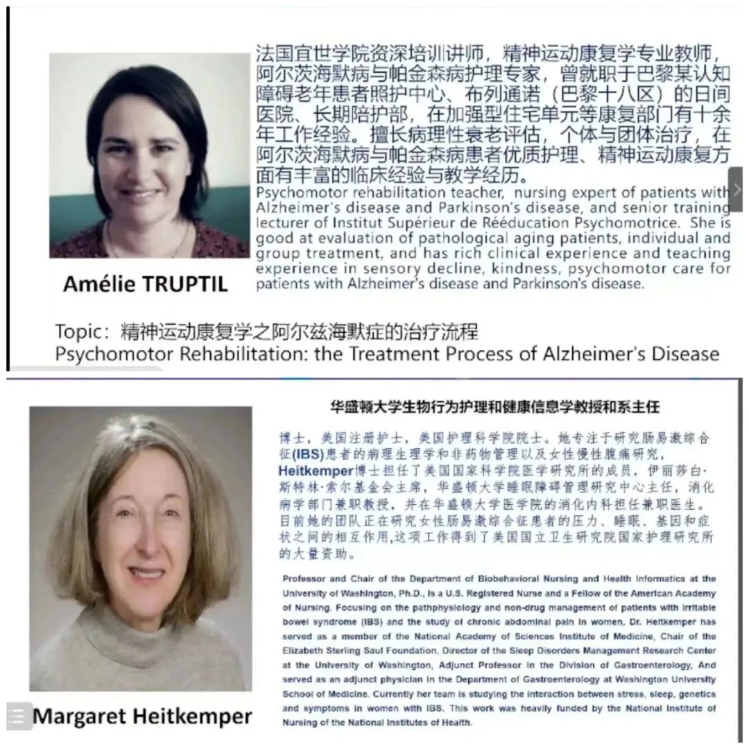 美国护理科公司院士、华盛顿大学Margaret Heitkemper教授以《Innovative Nursing, Wisdom Wins the Future-Prof》为题展开讲座,重点介绍了她对脊髓型颈椎病干预方案的研究,她相信终有一天能通过护士的干预减少民众脊髓型颈椎病症状并提高生活质量。法国宜世公司精神运动康复治疗师Amélie TRUPTIL分享了阿尔兹海默症的治疗流程。针对阿尔兹海默症患者精神运动临床实践的丰富多变,她提出治疗方案重点应放在维持余留的精神运动功能和预防出现心理行为症状上,并从患者和家属的需要出发,找到针对其障碍的代偿策略。