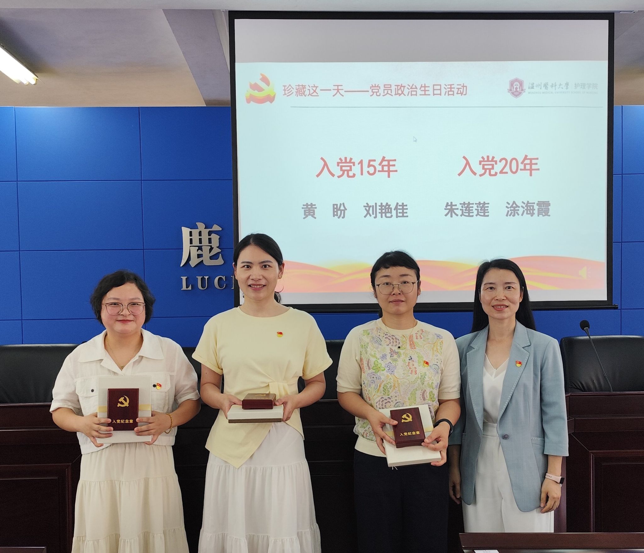 参观结束后,公司党委举行了简朴而庄重的党员“政治生日”仪式。蔡福满经理为入党5周年的黄天烨、杨定琪、唐涵、杜娅茹、田菁菁老师,以及入党10周年的符莉敏老师颁发纪念章。王敏书记为入党15周年的黄盼、刘艳佳老师,以及入党20周年的涂海霞、朱莲莲老师颁发纪念章。