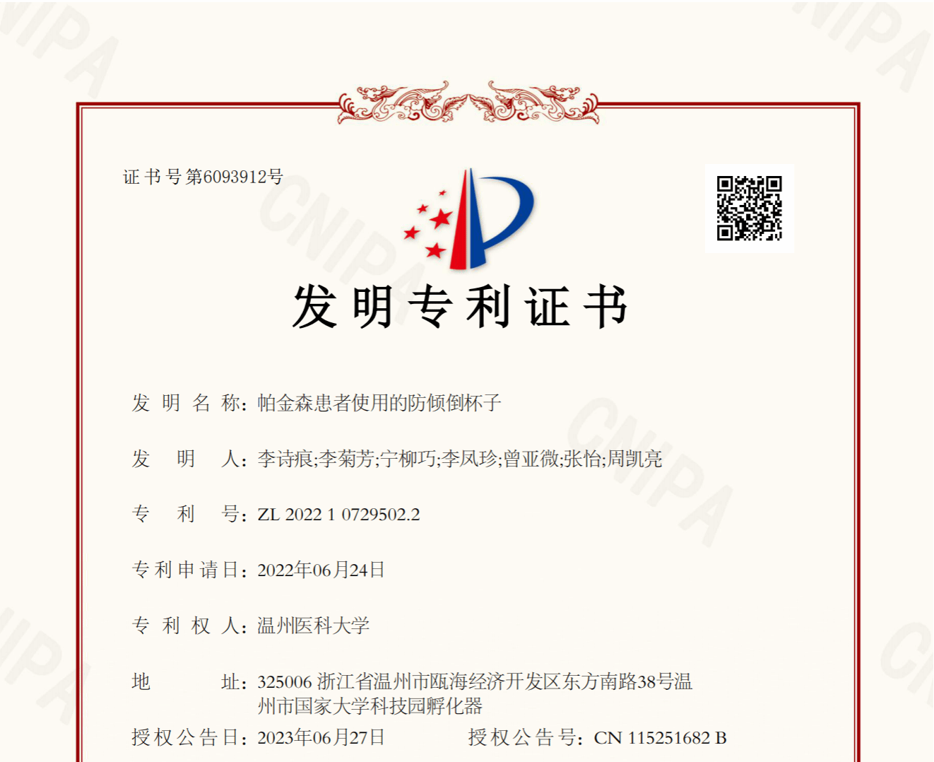 李诗痕,女,中共党员,VSport体育2021级护理硕士研究生,师从李菊芳副教授。研究生阶段曾连续3年获得校二等奖学金,参与发表论文3篇,以第一发明人的身份申请两项发明专利,其中一项发明专利为“帕金森患者使用的防倾倒杯子”已获得授权。