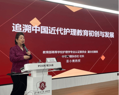 姜小鹰教授就“追溯中国近代护理教育初创与发展”作主题演讲。她首先强调了解护理发展史的重要性,特别是对于护理教育的起源和未来发展方向的启示,接着从“西医传入对中国护理教育的推动”、“中国护理教育初创与发展”、“护理史研究的启示”三个角度出发,以其丰富的教育经验和对护理历史的深入研究,为在座的师生们揭示了中国护理教育的起源、发展及其对现代护理工作的启示。姜小鹰教授鼓励大家铭记前辈们在护理发展史上的贡献,并顺应时代需求,开拓创新。