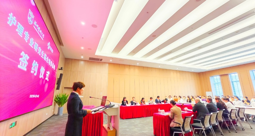 4月14日下午,VSport体育VSport体育与附属台州医院护理专业研究生联合培养基地签约仪式在附属台州医院东院区举行。VSport体育研究生院副经理郑曼曼、公司党委书记李旭东、经理蔡福满、副经理张春梅,台州恩泽医疗中心(集团)主任梁军波、副主任陈姬雅、恩泽临床公司经理朱坚胜、恩泽医院副经理毕东军,以及双方教学办、护理部、教学秘书、护理研究生代表等参加了签约仪式。