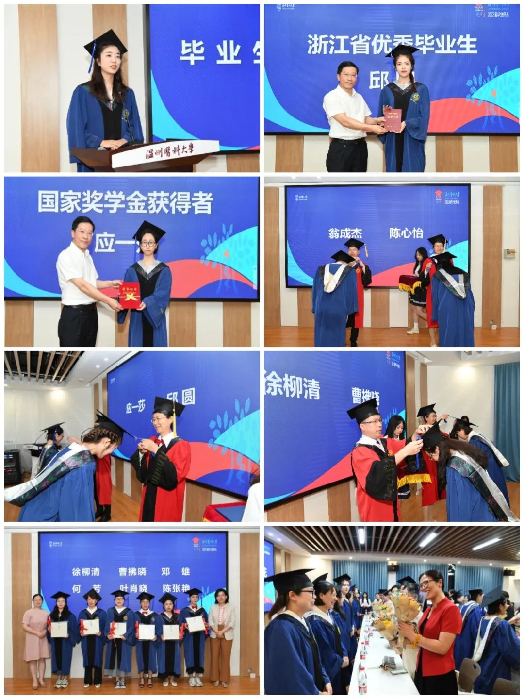 毕业生代表梁安东与大家分享自己研究生生涯的深切感受,并表示路虽远,行则降至;事虽难,做则可成。愿同学们在接下来各自滚烫的人生道路上继续保持信念和热爱前行,看见光、追逐光、接近光、成为光。李旭东书记为浙江省优秀毕业生邱圆和国家奖学金获得者应一莎颁发了荣誉证书。研究生导师尹志勤和蔡福满教授为在场所有毕业生拨穗,陈素云副书记和杨晔琴副经理为毕业生颁发员工荣誉证书和纪念品。各位毕业生们也为在场的领导、老师们献上鲜花,泪眼朦胧中叙述着依依不舍和浓浓的师生情谊。