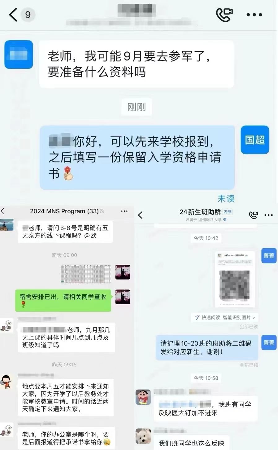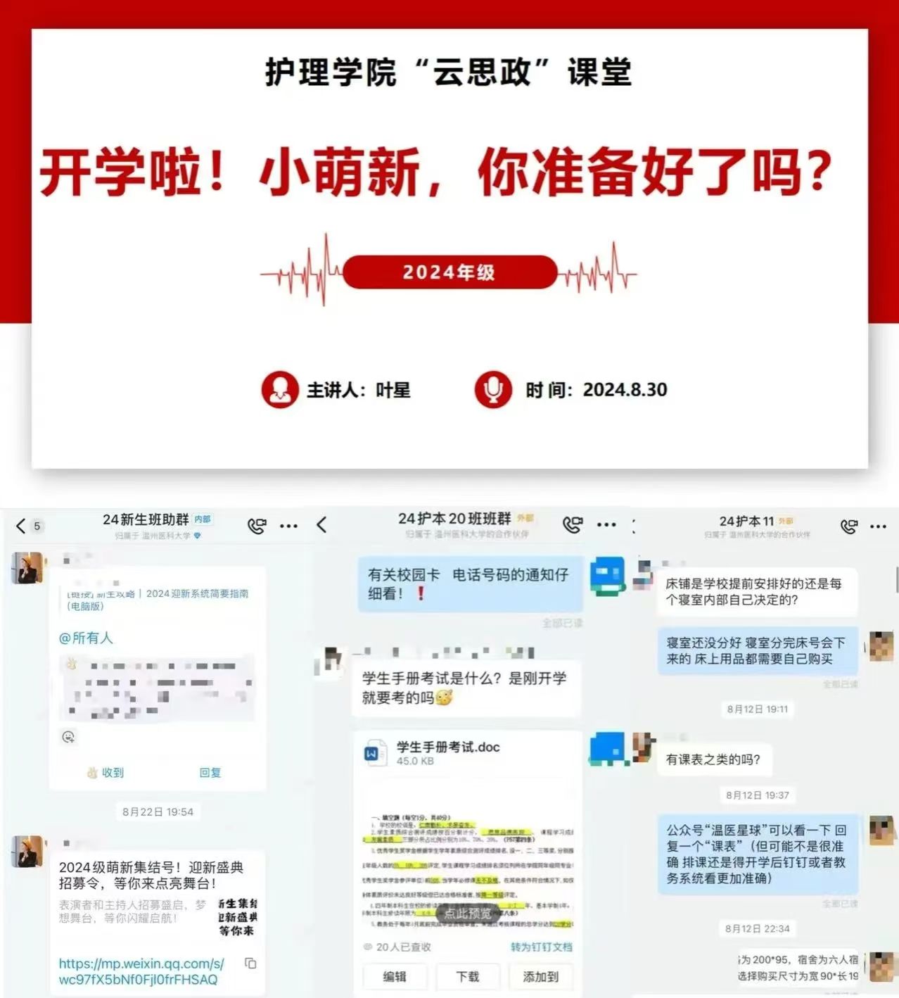 在新生开学前,新生辅导员们有条不紊地开展各项工作。安排组建班助群、新生班级群、开展年级大会等工作,热心解答新生们关于入校生活、学习安排、社团活动等方面的疑惑。通过线上平台,新生辅导员向萌新们介绍入学指南,说明报到注意事项,为新生顺利开学报到保驾护航。