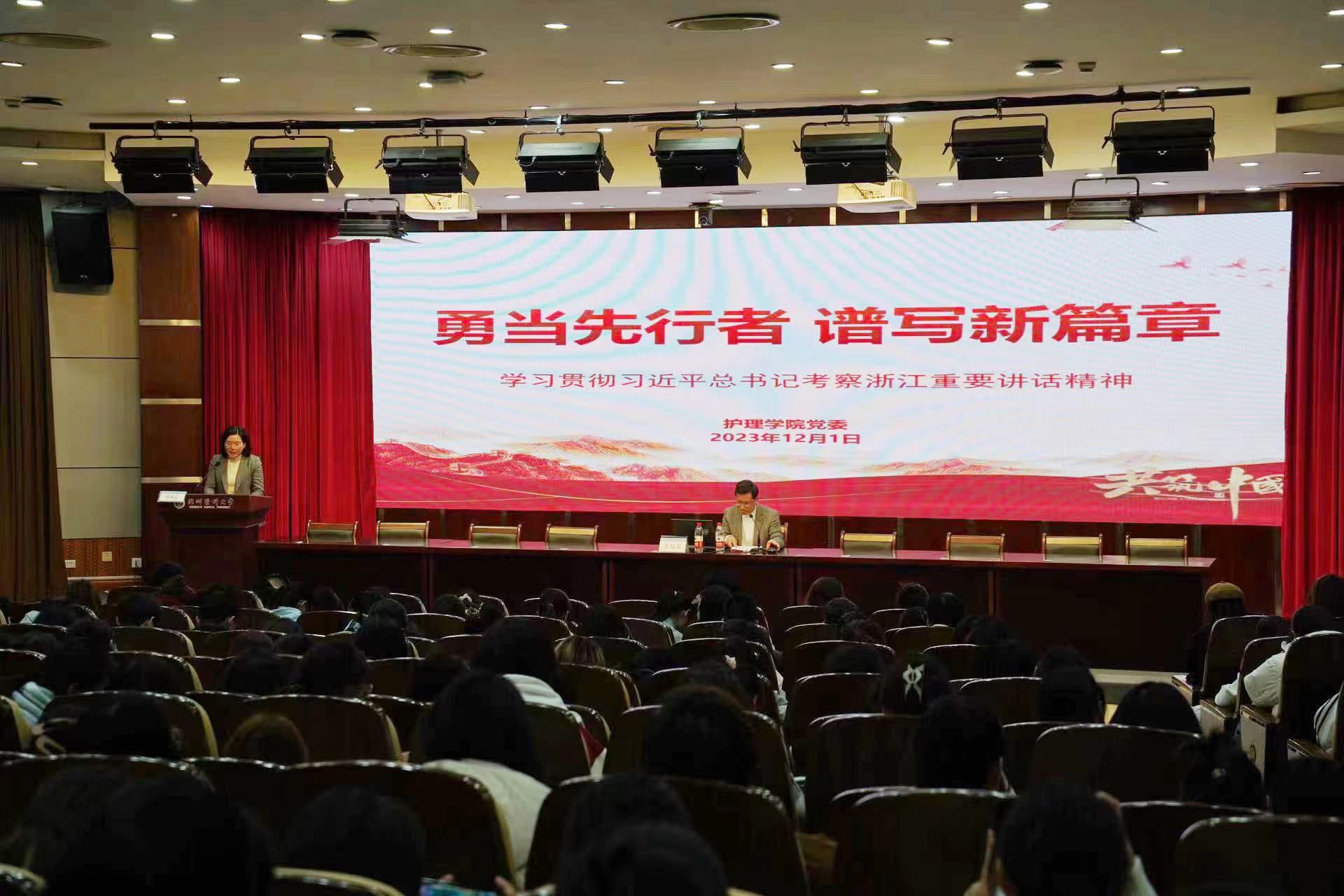 12月1日下午,VSport体育在茶山校区旭光厅召开深入学习贯彻习近平总书记考察浙江重要讲话精神学习会。党委书记李旭东作专题报告,党委副书记陈素云主持会议。全体辅导员、各级员工干部、党支部部分党员、发展对象和卓越护生参加会议。