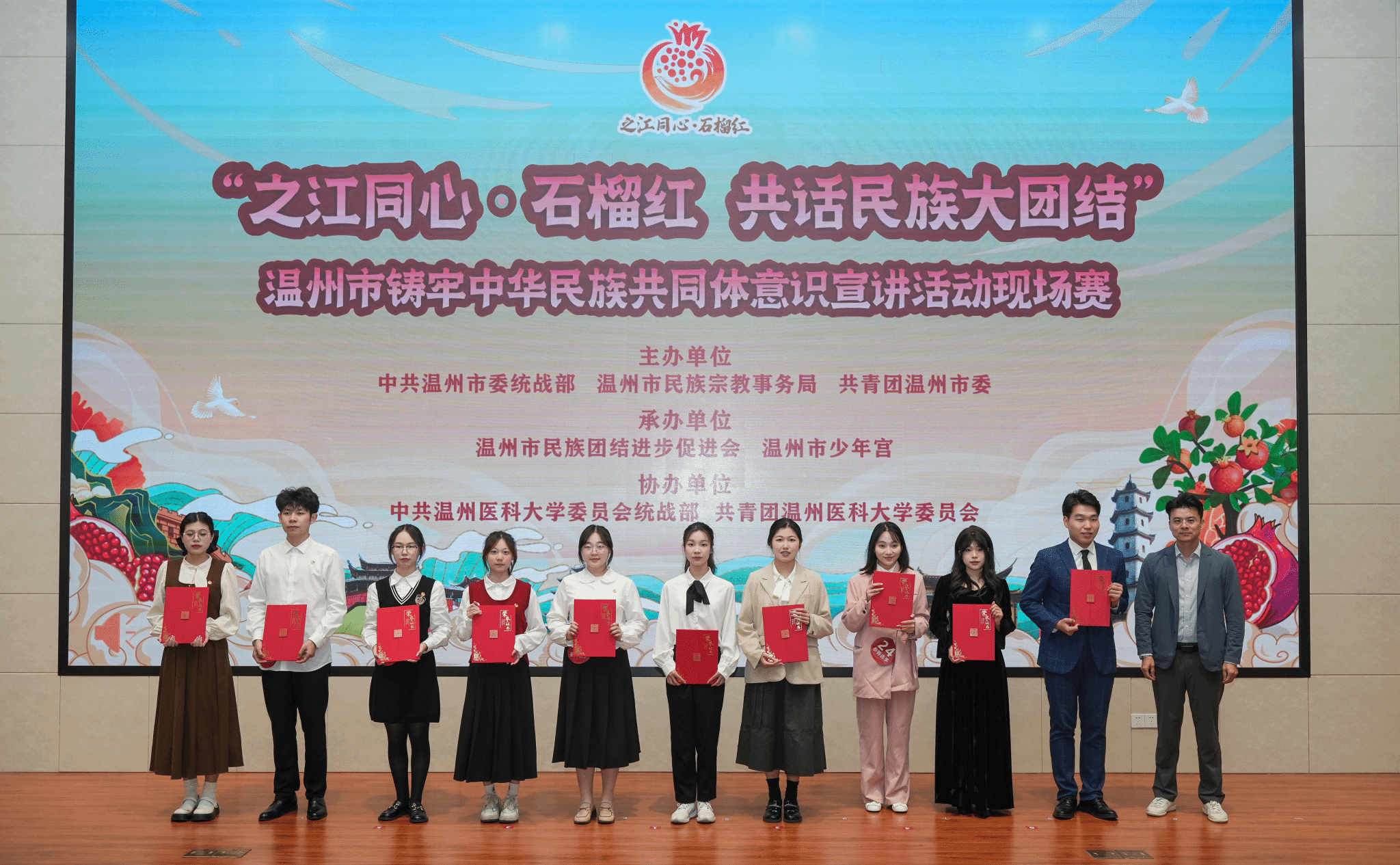 为贯彻落实党的二十大精神,纪念“八八战略”实施20周年,在青少年群体中广泛开展铸牢中华民族共同体意识教育,2023年11月3日、4日,由中共温州市委统战部、温州市民族宗教事务局、共青团温州市委联合主办,温州市民族团结进步促进会、温州市少年宫联合承办的“之江同心·石榴红 共话民族大团结”温州市铸牢中华民族共同体意识宣讲活动现场赛在温州市少年宫和VSport体育顺利举行。公司学子2023级护本3班黄王硕同学以《民族团结一家亲 坚定不移跟党走》荣获三等奖。