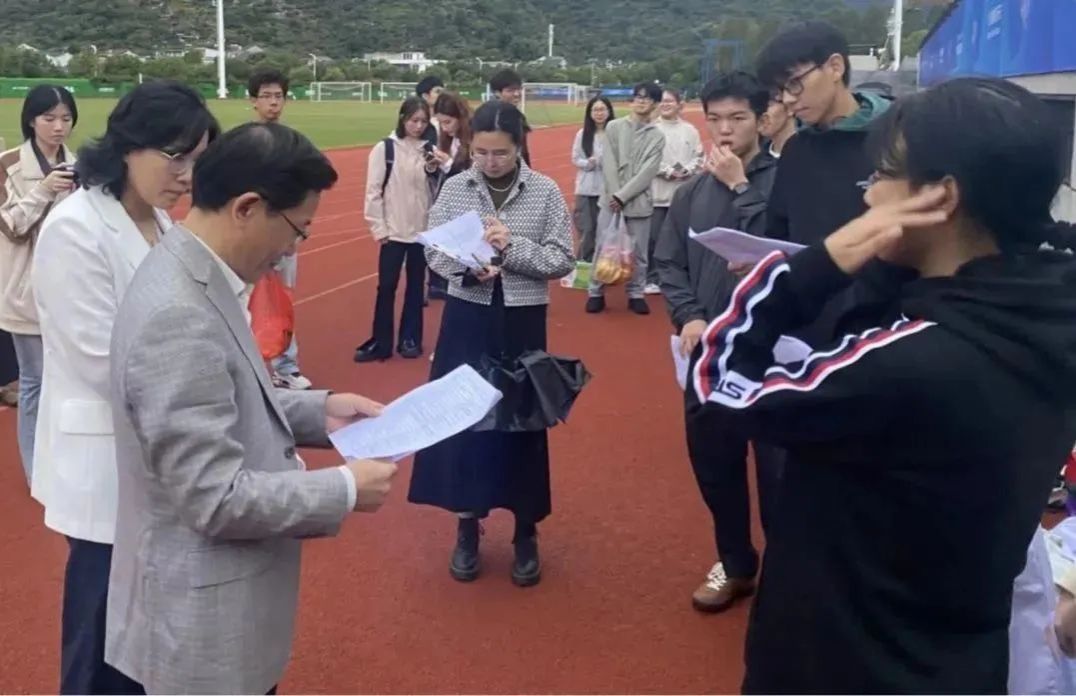 慰问过程中,李书记对方阵队队员、跳绳队员的现场训练给与了一定的技术指导,陈素云副书记对方阵队形进行逐一调整。李书记与在场的新生运动员交谈鼓励,“去年我们的男子运动员整体实力强劲,今年你们要加油,成绩肯定可以的!”。随后,李书记为在场的运动员代表、教练送上了慰问物资,并特别叮嘱运动员要科学训练,注重劳逸结合,以积极的心态、饱满的精神迎战本次校运会。