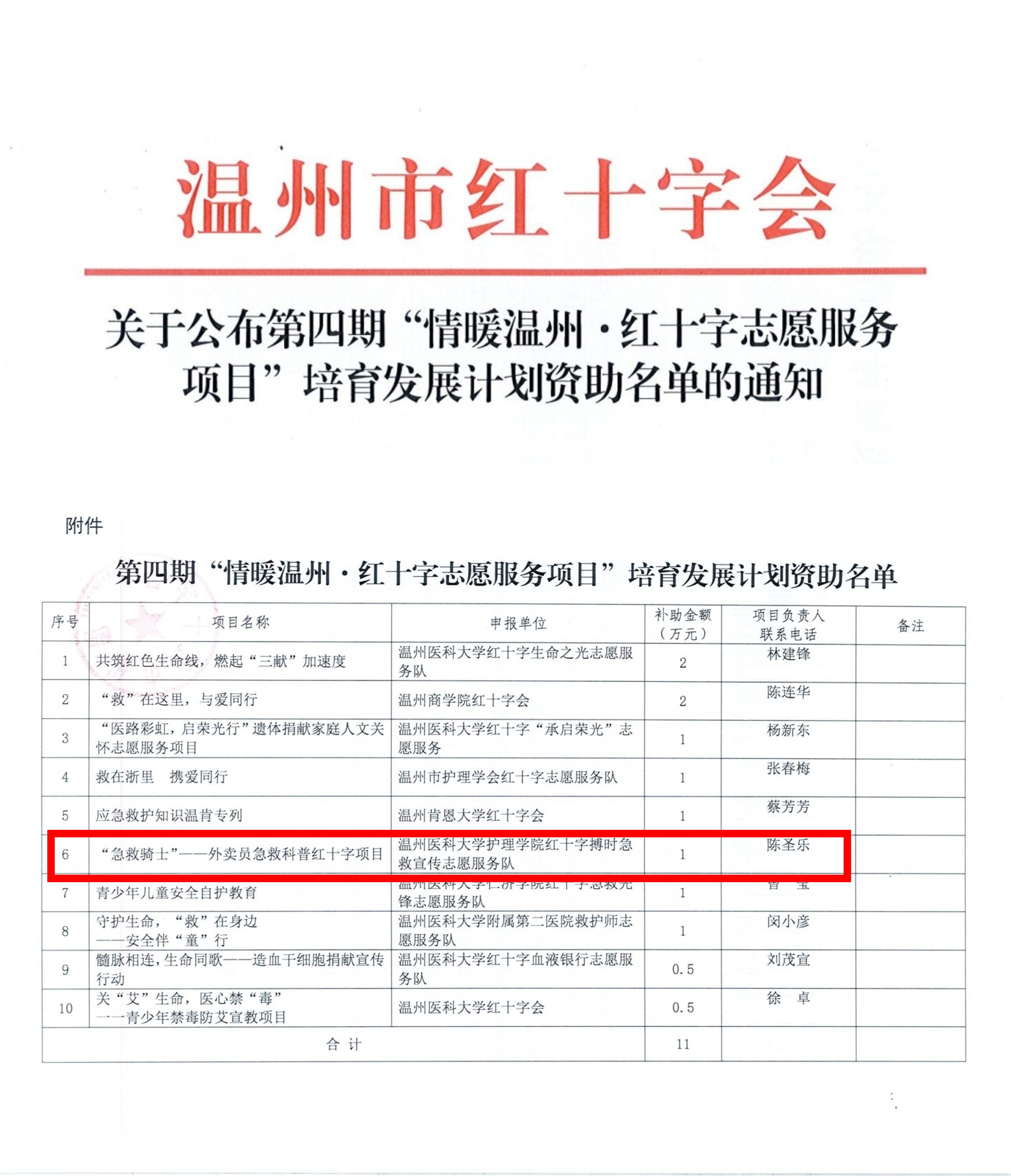 近日,温州市红十字会公布第四期“情暖温州·红十字志愿服务项目”培育发展计划资助名单,公司红十字搏时急救宣传志愿服务队的“急救骑士”——外卖员急救科普红十字项目志愿活动项目成功入选。