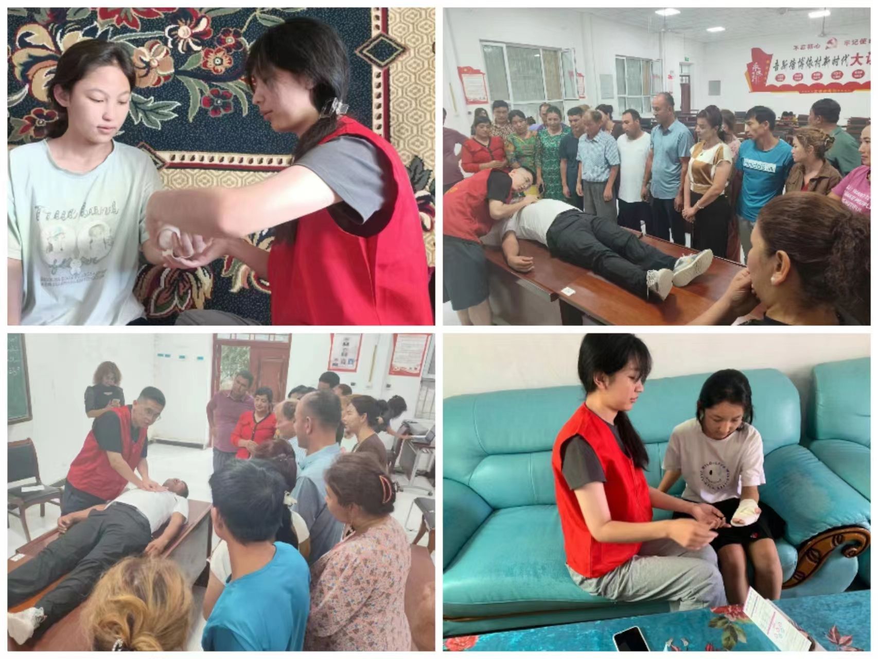 在活动过程中,实践团成员向居民们介绍了急救知识如:心肺复苏操作、止血包扎演示等操作,对一些普通话不好的村民亲切地使用维吾尔语哈萨克语向他们普及急救知识。教授的过程中,实践团成员深深感受到了群众的热情和期待。他们认真地听,仔细地模仿,不断地询问,看得出来他们希望自己在关键时刻,也能成为那个能够伸出援手的人。
