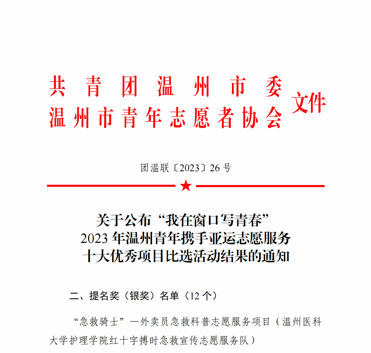 7月11日,公司白鸽青年志愿者服务社申报的“急救骑士”——外卖员急救科普志愿服务项目在由温州团市委、市青年志愿者协会举办的“我在窗口写青春”2023年温州青年携手亚运志愿服务十大优秀项目比选活动中喜获银奖。