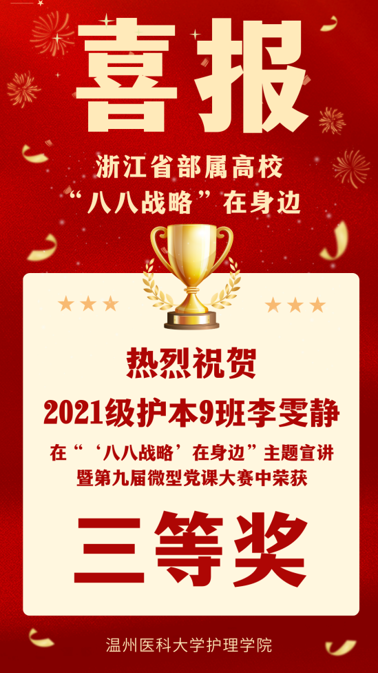 今年是“八八战略”实施20周年。为进一步学习宣传“八八战略”的丰富内涵和时代价值,6月30日,浙江省部属高校“‘八八战略’在身边”主题宣讲暨第九届微型党课大赛在浙江传媒公司举行。在该比赛中,公司2021级护本9班李雯静同学以《翻“山”越岭的竹笋》荣获“三等奖”!