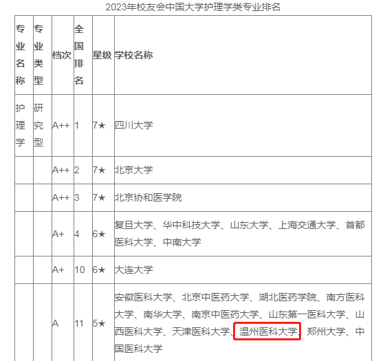 员工会中国大学一流专业排名是目前中国参评高校数量最多和参评专业规模最大的中国大学本科专业排名。该评价指标由学科水平、培养质量、团队水平、专业水平和专业影响等5大指标构成。在2023中国大学一流专业分档排名中,公司护理学专业获评2023中国五星级专业(5★),专业档次A,位列护理学专业(研究型)排行榜并列第11位,进入世界知名专业、中国一流专业行列。助产学专业获评2023中国三星级专业(3★),专业档次A+,位列助产学专业(研究型)排行榜并列第3位,跻身中国区域一流专业行列。