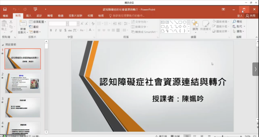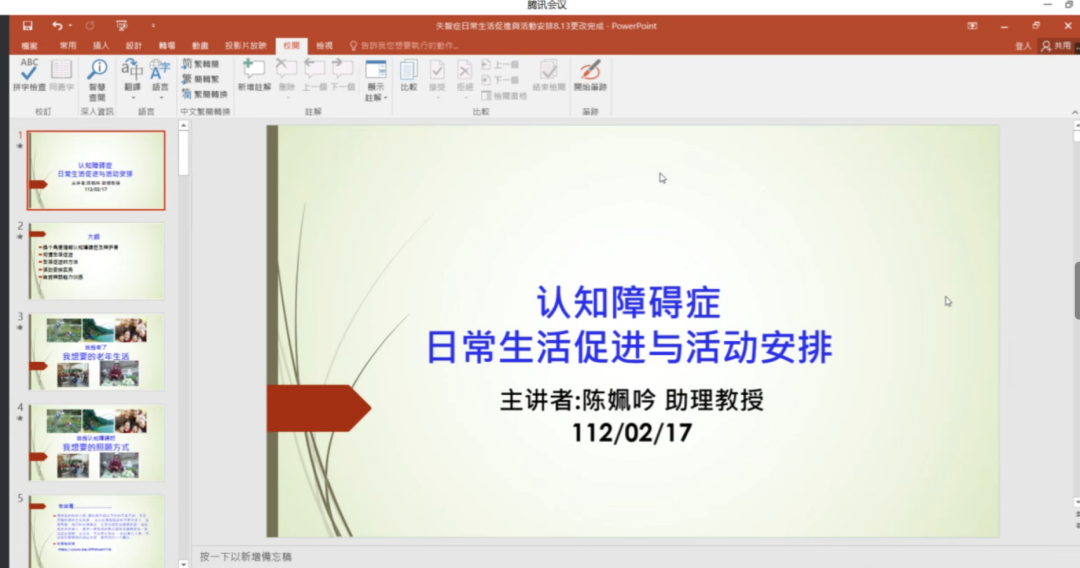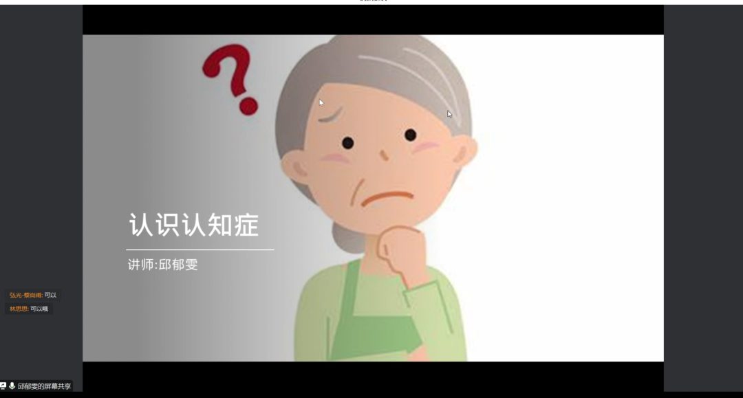 陈佩吟老师介绍了认知症的社会资源联结与转介,强调了包括政府、社会和家庭合力共筑的社会资源介入对引导认知症家庭正向能力发展、减轻主要照顾者心理负担的重要性。陈佩吟老师结合丰富的教学科研和社会服务经验,详细介绍了促进认知症患者生活的活动安排,对于师生们设计和开展针对认知症患者的研究课题和社会实践活动提供了重要的指导。