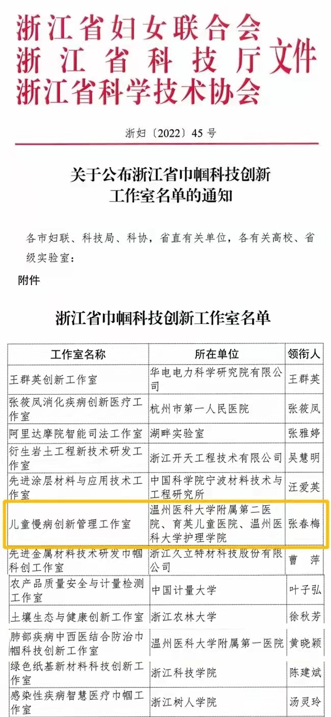 为深入贯彻落实浙江省第十五次党代会和全省科技创新大会精神,持续深化科技创新巾帼行动,推进女性科技人才为奋力推进“两个先行”贡献巾帼力量,近日,省妇联、省科技厅、省科协联合发文公布了“浙江省巾帼科技创新工作室”评选结果,公司张春梅副经理的“儿童慢病创新管理工作室”榜上有名,可喜可贺!