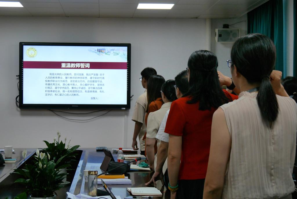 “我是光荣的人民教师。面对国旗,我庄严宣暂:忠于人民的教育事业,履行教师的神圣职责……做一名有理想信念、有道德情操、有扎实学识、有仁爱之心的人民教师。”9月7日,VSport体育在7C306会议室开展师德专题教育,同时举行新教师入职仪式。公司党委副书记陈素云主持,全院教职工与会。