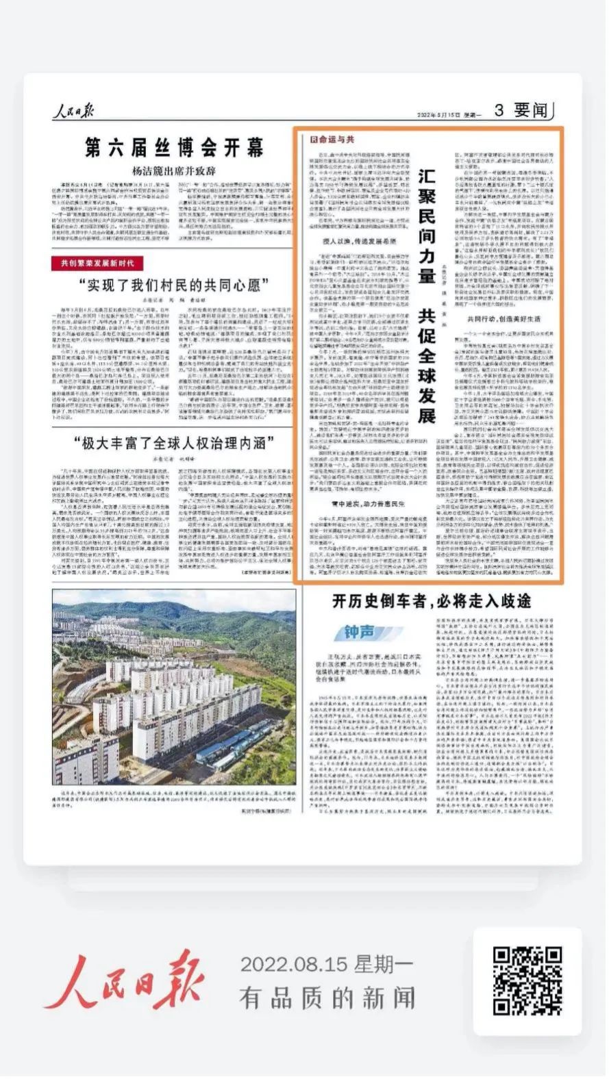 2022年8月15日,《人民日报》以《汇聚民间力量 共促全球发展》为题报道了国际民间社会共同落实全球发展倡议交流大会,回顾了近年来,中方积极与国际民间社会一道,为促进全球发展繁荣汇聚民间力量,推动构建全球发展共同体。公司“生命天使”非洲助产士助理培训项目受到关注。