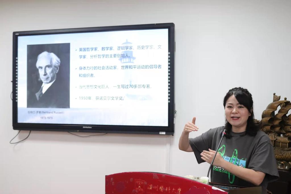 许芳芳老师朗读了伯兰特·罗素先生的散文诗《WHAT I HAVE LIVED FOR》(我为什么活着),详细介绍了罗素先生一生的经历。优美的文字娓娓道出了罗素先生的一生——为了“爱情”、“知识”和“同情”而活,展现了罗素先生的睿智温情,饱含着他悲天悯人的情怀,同时也启发我们思索“我们究竟为何而生”,并将人生哲学渗透进教育里。许芳芳老师用她攻读博士课程后创作的一系列画作生动诠释了守护内心的纯真之情,提醒我们无论多忙都不要失却生活。