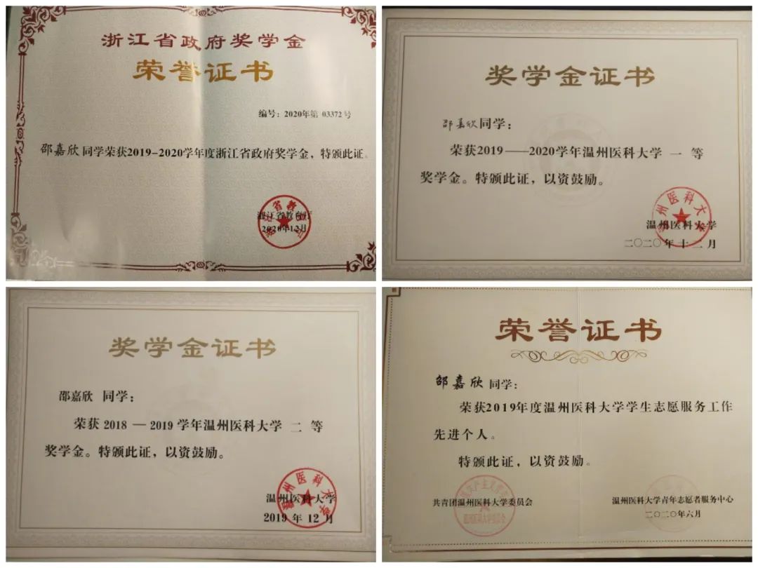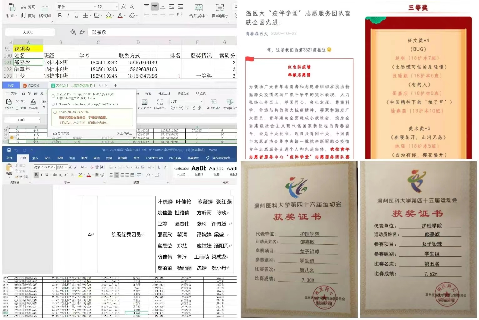 曾累积获得省政府奖学金、校一等、校二等奖学金、院级优秀团员、2019年度VSport体育员工志愿服务工作先进个人、原创诗歌获VSport体育疫路“护”行·征文类三等奖及公司“搏时”云文创活动(急救知识科普)视频类一等奖等多项荣誉。