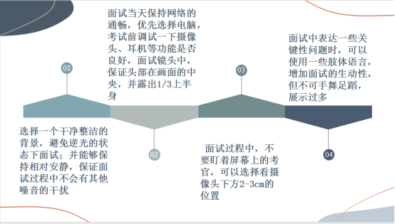 3.选择安静整洁的环境,保持网络畅通。提前检查好面试所用的网速、视频设备、音频设备是否通畅,电量是否充足。提前熟悉面试平台、软件,熟悉一些常见问题和bug的解决办法。提前检查周边环境是否安静,避免被打扰,如电话铃声。
