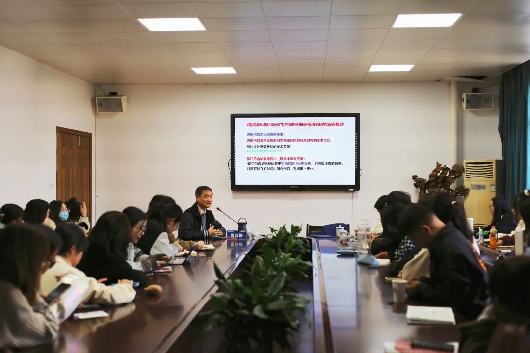 谈到护理创新设计理念,他强调了论题措辞的精准性、摘要的关键性以及首段首句的重要性等对于科研论文写作的价值。罗教授以如何从中医护理中挖掘科研素材为例,从“采用的中药方剂是否有辩证依据”、“生物安全质量指标是如何做质控的”、“敷贴采用了什么基材”等问题入手,一步一步细致讲解,引领大家进行了一次集辩证、严谨、创新于一体的循证设计探索。授人以鱼不如授人以渔,罗教授还分享了科研成长的心路练习,如“写下自己喜欢自己的理由”、“睡前坚持做一分钟心灵健康操”等,还给在座学子布置了一个有趣的回家作业。他强调了好习惯的培养和坚持的重要性,指出了科研非一朝一夕所成,而是日积月累、滴水石穿。