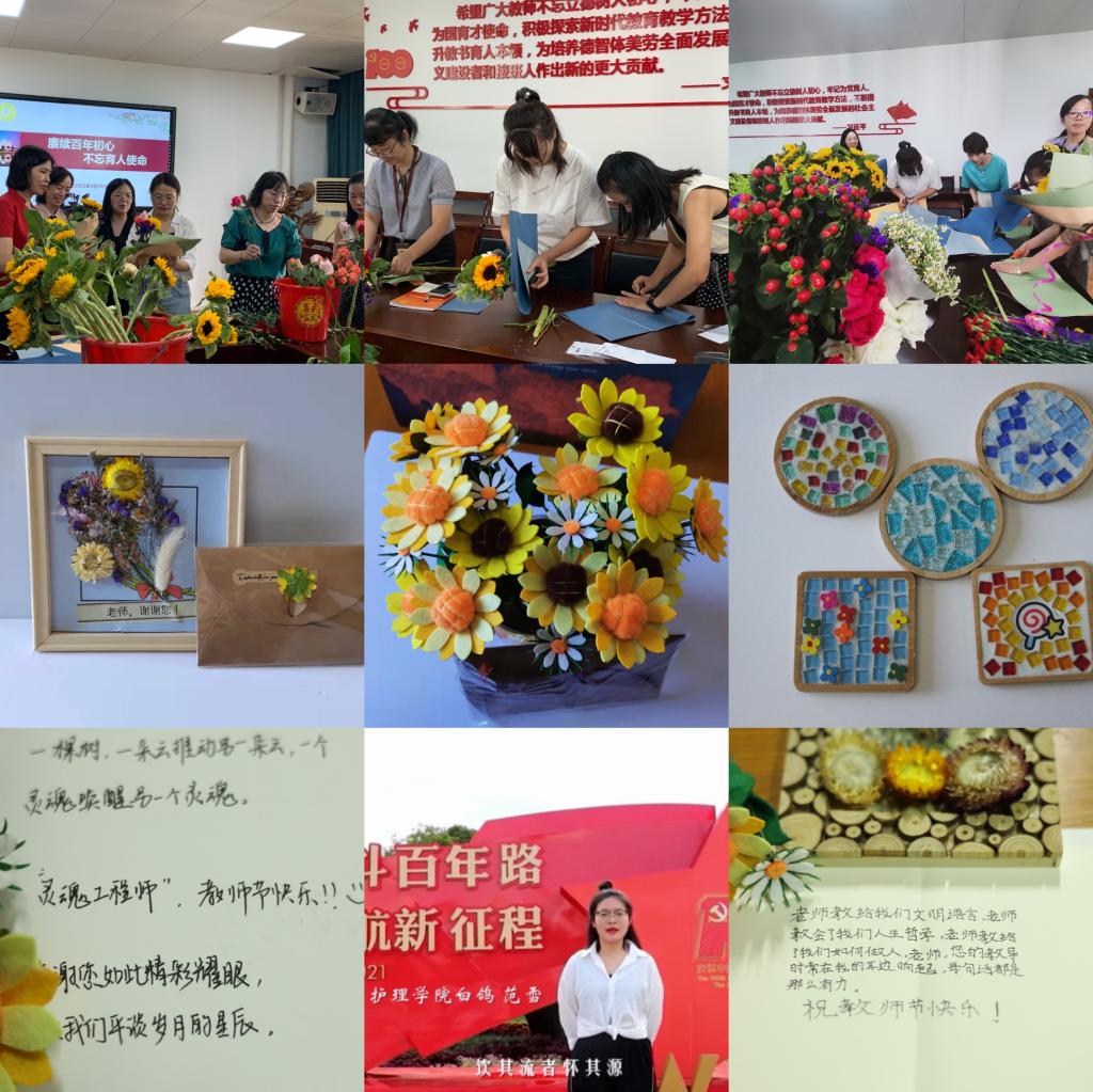此外,公司通过短信向公司教师和临床教师送祝福,感谢所有老师为教育事业作出的贡献,并通过宣传橱窗,营造尊师重教的氛围。同时,举办创意花艺设计活动,观看电影《一生只为一事来》,让老师在忙碌工作的闲暇之余放松身心。同学们则拍摄祝福视频,专属定制包括手工花、减压小礼物、杯垫、拼接日历、戳戳绣等在内的一系列暖心小礼物,将满心的感恩与真挚送给老师们。