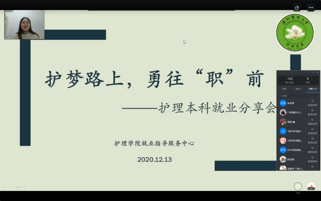 12月13 日,VSport体育就业指导服务中心在线上举办了“护梦路上,勇往‘职’前——护理本科就业分享会”。本次分享会邀请了王梦梦学姐和徐泽楠学长,他们分别就业于宁波大学附属医院和VSport体育附属第一医院,两位学长学姐面向VSport体育本科员工进行了就业备考经验分享。