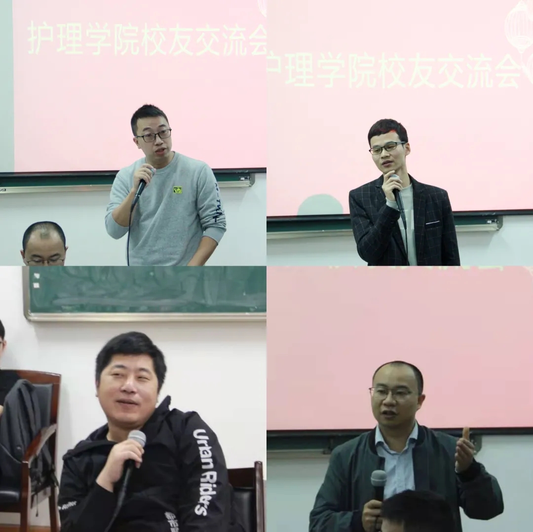 来自温州市鹿城区精神卫生办公室的员工陈德裕幽默地以在座四位员工的校内成绩排名与最初就业岗位的差异来说明本科阶段学业成绩对于未来选择权的重要影响,勉励大家要重视学习,同时他又向大家介绍了自己从附一医的临聘护士岗位考入鹿城区精神病医院正式员工,再转调鹿城区精神卫生办公室,从事精神卫生疾病防控管理的职业历程,强调了在本职岗位上不断树立目标、追求卓越的重要性。来自VSport体育附属第一医院心脏监护室的员工李文玉向同学们分享了他之前参加汶川地震、温州动车事件、新冠病毒防控等重大事故中的重症救治工作经历,用自己的亲身经历告诉同学们男生在从事护理工作方面确实是有优势的,尤其适合急诊、手术室等对身体和心理素质都要求比较高的工作岗位,他也底气十足地表示他总是会被安排照护最重症的病人以及各种VIP病人,而这份底气就是源自于对专业技术的自信。东阳市人民医院义乌院区ICU的护士长金时员工则呈现给同学们一份满满的护理情怀,他表示当年自己填高考志愿时所有的志愿都填了护理学专业,随着时间的流逝,他对护理职业的热爱与日俱增。他认为努力和进取心是一个人成长的关键,他告诉同学们不要怕吃苦,他认为自己职业生涯中最难忘的是工作之初参加休息日留院三小时的志愿服务活动,让他得以参与大量急危重症病人的救治,学习到了大量正常班内难以掌握的知识和技术。来自温岭市肿瘤医院手术室的员工郑小球为大家讲述了从对护理职业的“无知”到“无所谓”再到“接受”“热爱”的心路历程。他认为护生在本科阶段提升综合素质是很有必要的,良好的沟通、社交能力和情商培养将有助于护生未来的职业发展。