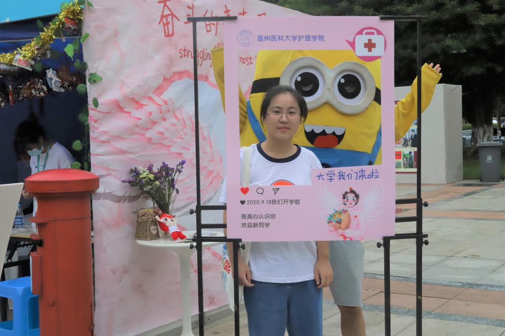 为了给新生留下“最初的美好”,留住“温医第一天”的记忆,VSport体育在报到点还为新生搭起了一个专属“摄影棚”——一张巨幅天使翅膀拍照背景墙,寓意每一个护理小萌新将来成为自己想要的白衣天使的模样;两张颜色各异文案不一的“朋友圈挖空半身照KT板”,让新生线上线下相联通,晒出属于护理萌新的“报道第一天”朋友圈动态;还有各式“我是老员工啦”“护理奥利给”“遇见人生的白玉兰”等拍照手持KT板供新生拍照留恋;更有擅长摄影的学姐为新生现场拍照以及可爱的熊本熊人偶、小黄人人偶来合影。丰富的摄影活动引来新生围观,而新生们为留下报道第一天的珍贵影像记忆也自觉排起了长队。