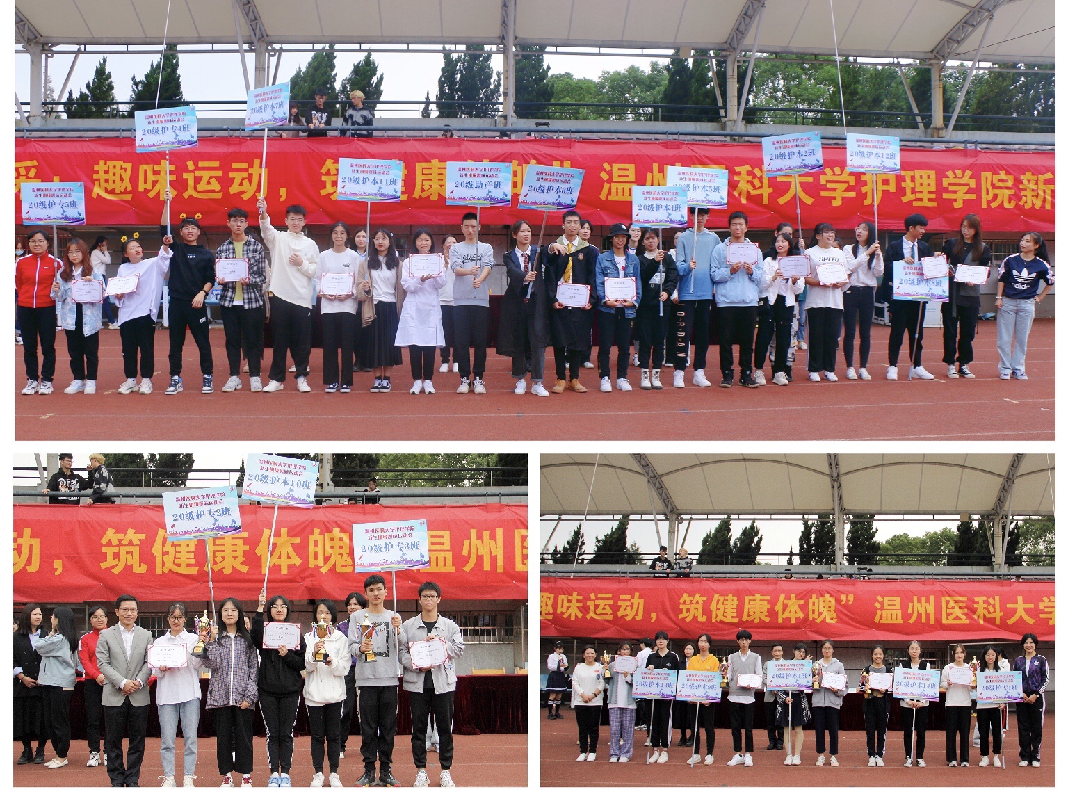 经过多个项目激烈的角逐,20护本10班在众多班级中脱颖而出,获得冠军!20护专2班、20护专3班凭借班级强大的团队凝聚力和意志力,分别获得第二名、第三名的好成绩!获得第四名到第八名的班级是20护本14班,20护专1班,20护本9班,20护本1班,20护本13班。其余班级奋力拼搏,在操场上挥洒青春的汗水,也获得了一份满意的成绩。