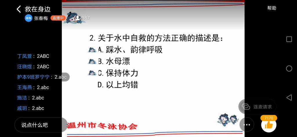 随后,张经理向同学们详细阐述了水上自救的原则和立泳、水母漂、仰漂等自救方法,并告知同学们溺水救人时应遵循岸上优先、工具优先、团队优先、求助优先的原则。讲座的最后有奖竞答环节,同学们踊跃回答问题,进一步巩固了防溺水救护知识。