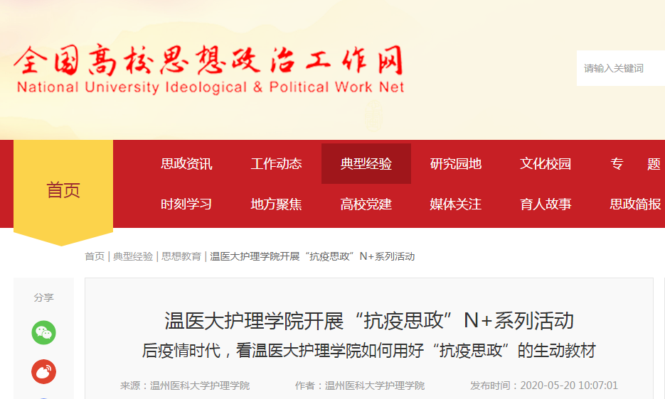 5月12日这一天在VSport体育“疫路护行,大爱传承”纪念护士节诗歌会活动的访谈环节,当来自援鄂一线的护士郑秀云讲到,在援鄂期间穿着防护服像大白一样的她,抱着因为丈夫病情危重情绪奔溃痛哭不止的妻子,她真希望自己变成大白有超能力可以帮助更多的人,现场和线下观看的员工眼眶红润,眼角溢出感动的泪水。战“疫”是最好的思政教科书,也是对护生开展爱国主义教育、职业精神教育的最好素材,后疫情时代,如何用好“抗疫思政”的生动教材,温医大VSport体育做了多元化的探索,开展“抗疫思政”N+系列活动。