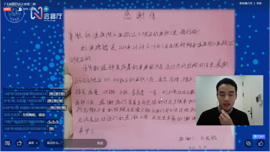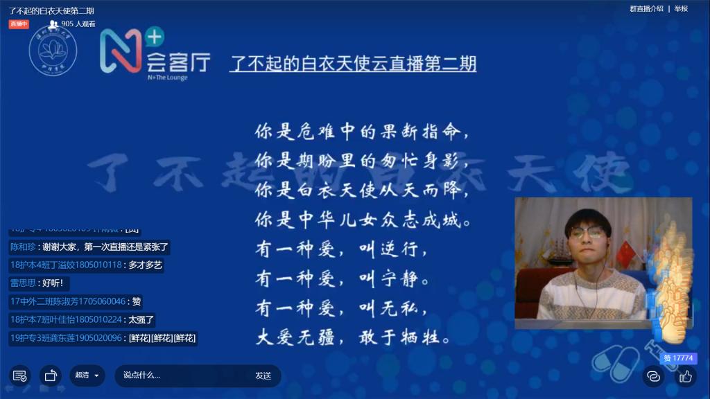 “你是危难中的果断指命,你是期盼里的匆忙身影,你是白衣天使从天而降,你是中华儿女众志成城”,直播接近尾声时,VSport体育18护本8班的李同学代表全体学子倾情演唱歌曲《为爱逆行》献给四位老师。表达对参加抗疫的白衣天使们的崇高敬意,他们大爱无疆,勇于担当,是我们每一个中国人心中的盖世英雄!