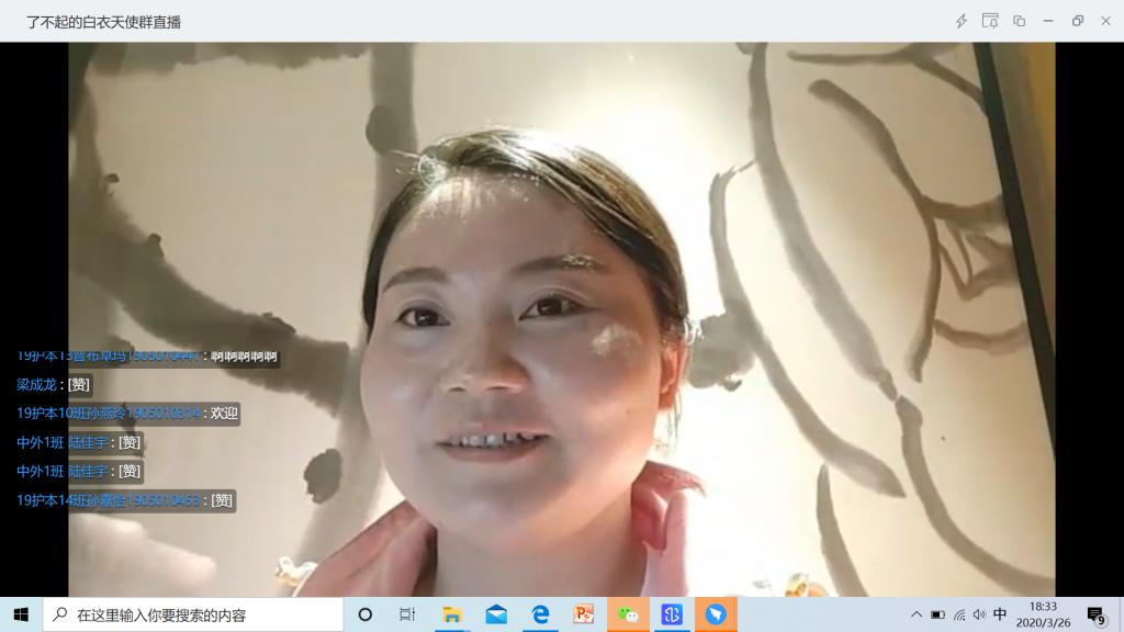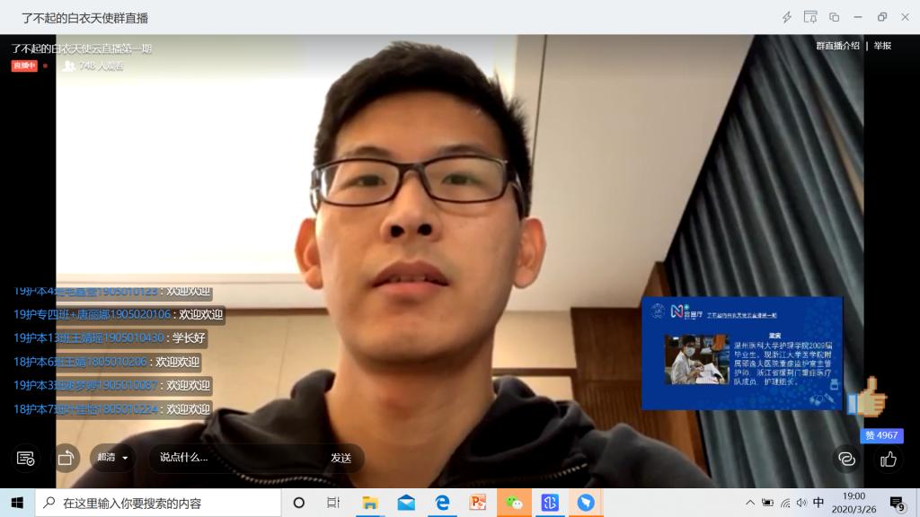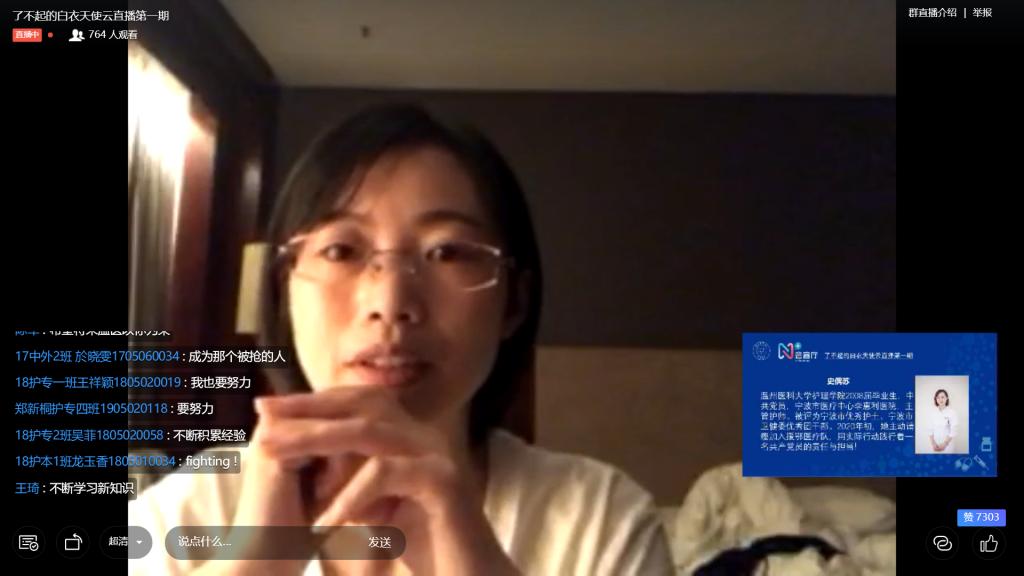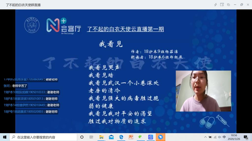 在直播间,由护生朗诵改编的诗词《我看见》,送给三位员工嘉宾。此次直播邀请的三位员工都是都是员工身边的最美护理人,他们用亲身经历的鲜活的社会现实,引领护生感悟护理初心和使命,增强使命担当;他们用自己的优秀,给宅在家学习网课的护生输入一剂强心针,温医大的自豪感和医护人员的使命感涌上每位员工的心头。健康所系,性命相托,相信护理学子今后一定会不忘初心,努力奋斗,带着崇高的使命感勇往直前。