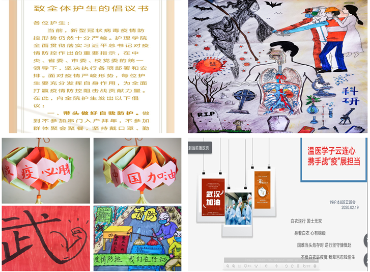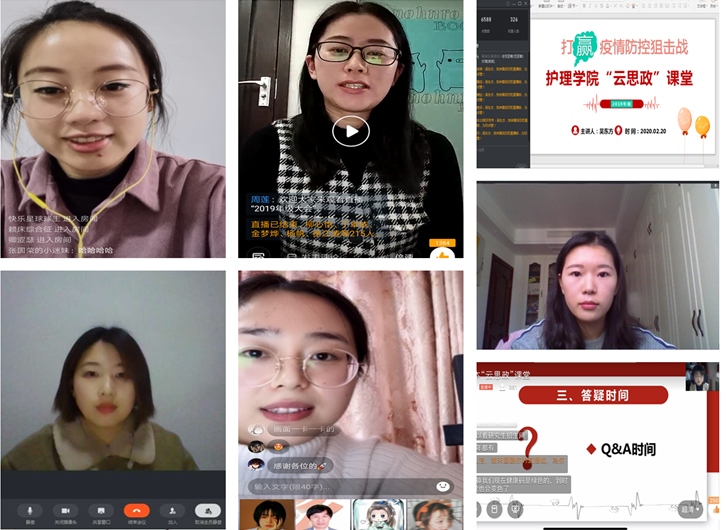 “每位护生要充分发挥自身作用,为全面打赢疫情防控阻击战贡献力量。”辅导员们在“云思政”课堂上再一次宣读了前期发起的《致全体护生的倡议书》,引导护生们做好“五带头”,即:带头做好自我防护、带头提高科学认知、带头遵守公司安排、带头配合防控工作、带头增强必胜信念,充分发挥专业优势,为打赢疫情防控阻击战贡献自己的力量。在“云思政”课堂上,辅导员陈琦结合自己近期在温州市卫健委志愿服务的经历分享当前温州的疫情实况,并结合自己的心理专业知识与员工分享疫情期间保持心理健康和进行心理疏导的正确方式;辅导员李萌向员工宣讲最美逆行者们的英雄事迹以及全国人民众志成城、共克时艰的做法,并为员工推荐一系列文学经典、哲学经典、心理学以及个人成长类的书籍,激励同学们做好规划,利用这个史上最长寒假给自己“充满电”。辅导员们向各班级传达了“温医学子云连心 携手战‘疫’展担当”云班会、“战‘疫’有我,青春同行”特别主题团日活动的通知,组织各班级开展“面对疫情,我们怎么做”大讨论以及一句话为武汉、为中国加油等活动;辅导员们还特别向同学们介绍了前期公司教学办与学工办联合推出的“疫路‘护’行”栏目,鼓励同学们多思考、多参与、多投稿,引导员工秉持“仁肃勤朴、求是奋发”的校训和 “勤勉、仁爱、慎独、求真”的院训,提高思想认知,彰显青年担当,做“担使命、保安康的守护者,宅其身、抱道行的修行者,游必有方的识途者、‘四个自信’的坚定者”。