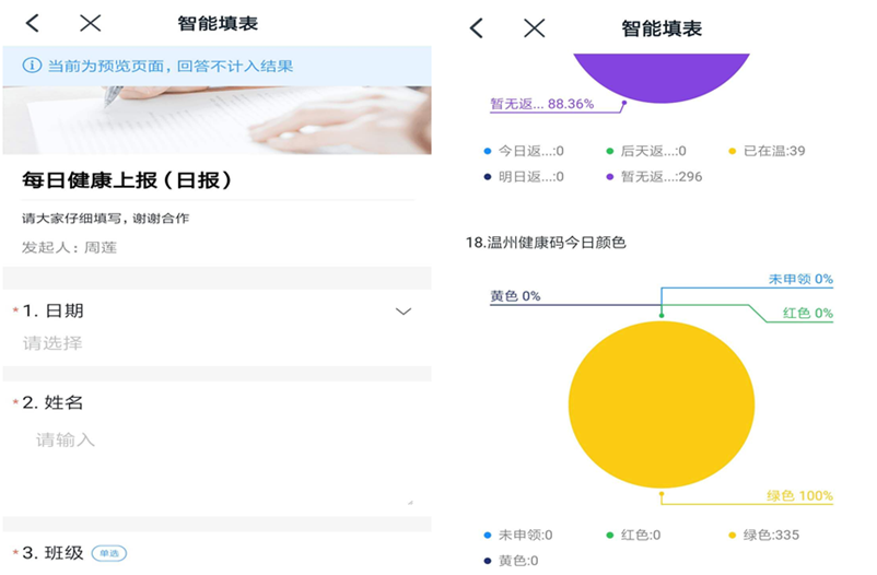 “当前,正处于打赢疫情防控阻击战的重要阶段,根据温州市委的部署,各级各类公司延期至3月1日之后开学,在开学前,所有同学不能返校……”辅导员们再三跟员工强调在3月1日之前,不在温员工不返温、在温员工不返校,并一再提醒员工减少外出,注意防护。同时,辅导员们结合前期通过钉钉、问卷星等平台制定的《每日健康调查问卷》的内容,提醒员工每天填写问卷进行打卡,每天两次如实上报自己及家人的身体身体状况,并强调如有特殊情况及时与辅导员联系,确保每天及时掌握员工信息。同时,辅导员们面向全体员工讲解“温州健康码”的领取方式和使用方法,确保健康码领取率100%。为考察员工对疫情的认知,辅导员王茹新还在“云思政”课堂上设置了“疫情知多少”问答环节,给员工们线上解答《2020新型冠状病毒防治统一考试(全国卷)》的内容,得到了员工的一致点赞。