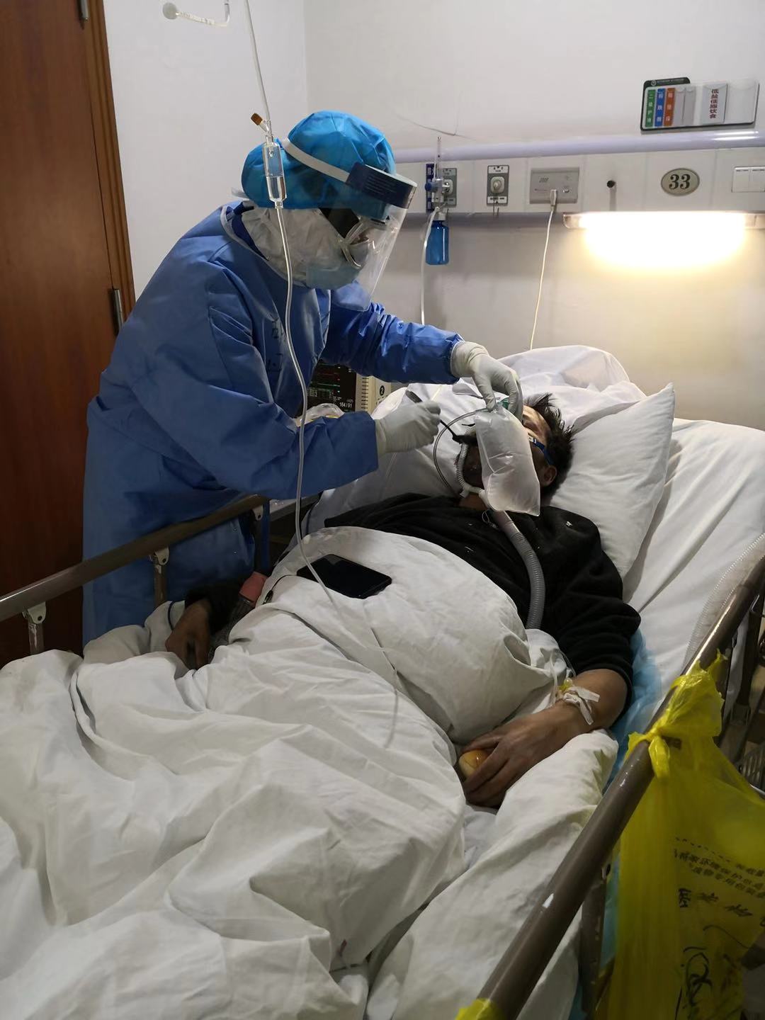 陈叡喆,2017届护理学子,公司附属第一医院护士,1月22日收到医院通知后立即通过护士长报名,2月7日加入医院一线抗疫队伍,被分配在隔离重症病房。每天,他会提前到达病房,照顾轻症患者的生活起居,同时密切观察他们的心理变化,做好心理护理;协助重症患者翻身拍背如厕测量体温,进行系统评估,密切观察生命体征、治疗效果,查看化验结果、血气分析和化验指标并正确记录,及时与医生沟通,还需做好仪器设备等的擦拭消毒。每天上班6小时加上换衣服脱衣服1小时,中途不喝水不上厕所不吃饭。下班后不回家前往专门为医护人员准备的生活区,像“住大学寝室一样”,为避免家人担心,他坚持每日报平安。