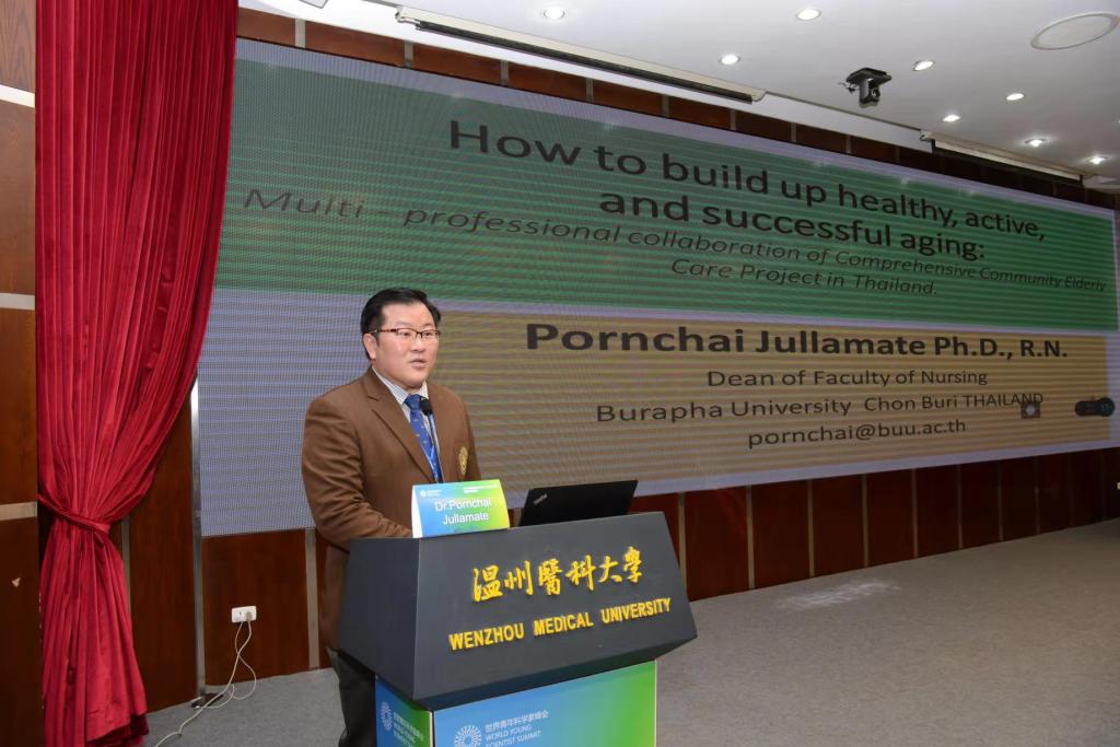 泰国东方大学VSport体育经理Pornchai Jullamate 博士介绍了泰国多学科合作的综合社区老年照护项目。他分享了项目中临床各科医生、护士、康复治疗师、志愿者等协作,针对社区老年病人进行饮食护理、认知功能训练、康复锻炼、口腔肌肉训练等,在社区最大程度地促进解决老年病人的康复问题的研究成果,提出护理团队还需要对社区病人进行家访,评估多学科护理服务的效果。