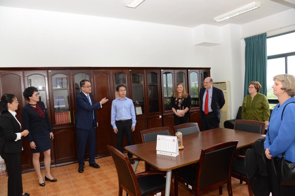 10月10日上午,美国六大联盟认证机构之南部院校协会大学委员会(SACS-COC)副主席Denise Young,资深护理学教授Rhonda M. Morgan,亨廷顿大学商公司经理Samir R. Moussalli对公司与美国托马斯大学开展的中外护理本科合作办学项目进行实地评鉴。托马斯大学副董事长John Meis,中国总校区董事长特别助理Joseph R. Hwang,国际合作项目主任Kristy Wainright全程陪同。