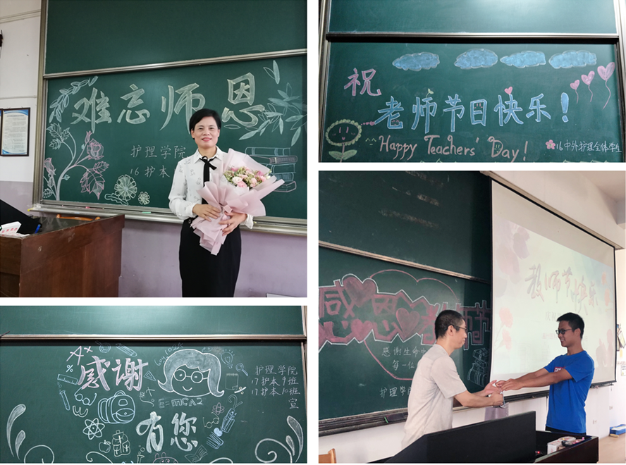 教师节前一天,员工们用粉笔一笔一画描绘出与老师的温馨时光,每一块板报上都传递着同学们对老师美好的祝福。