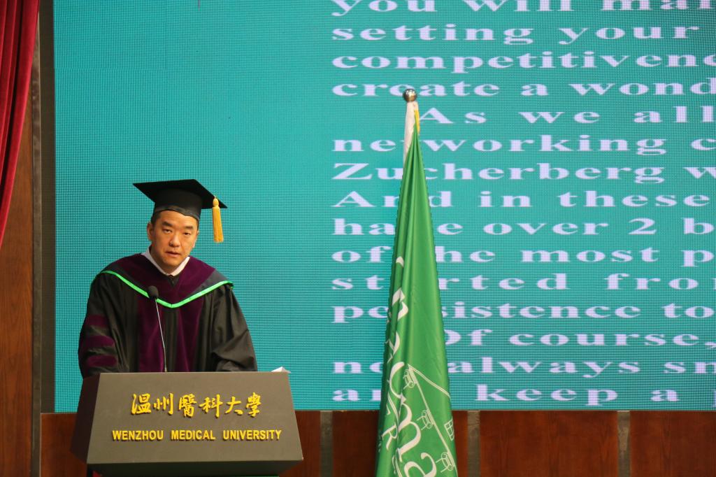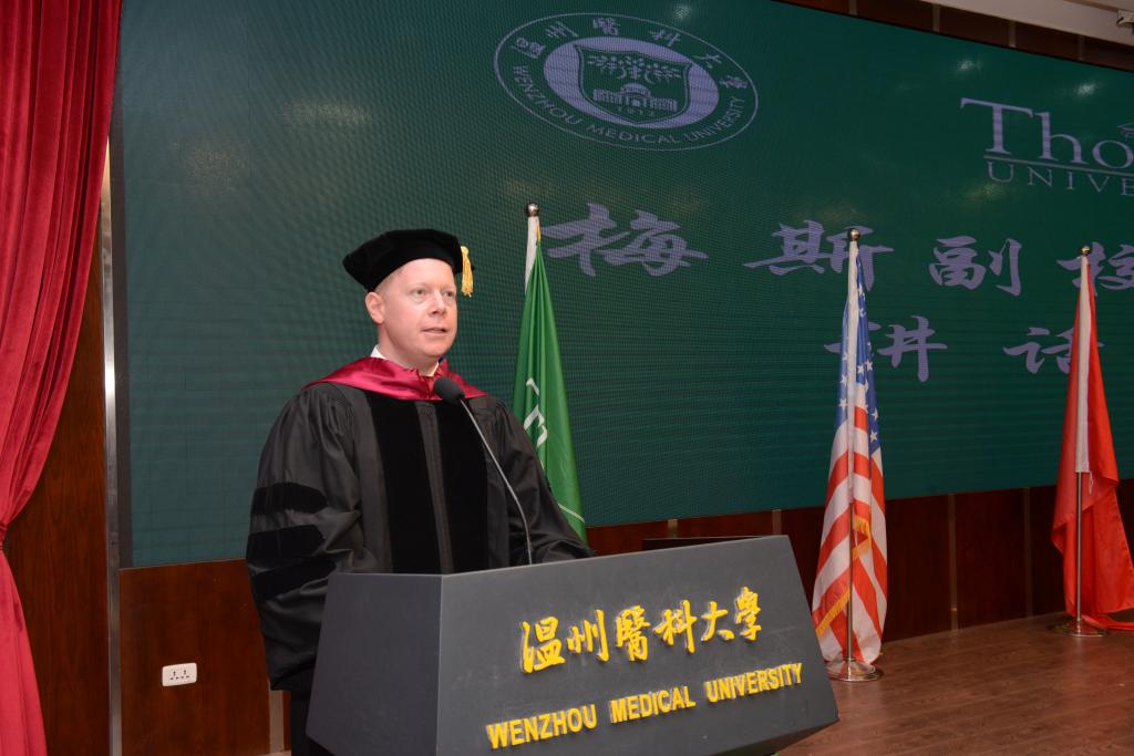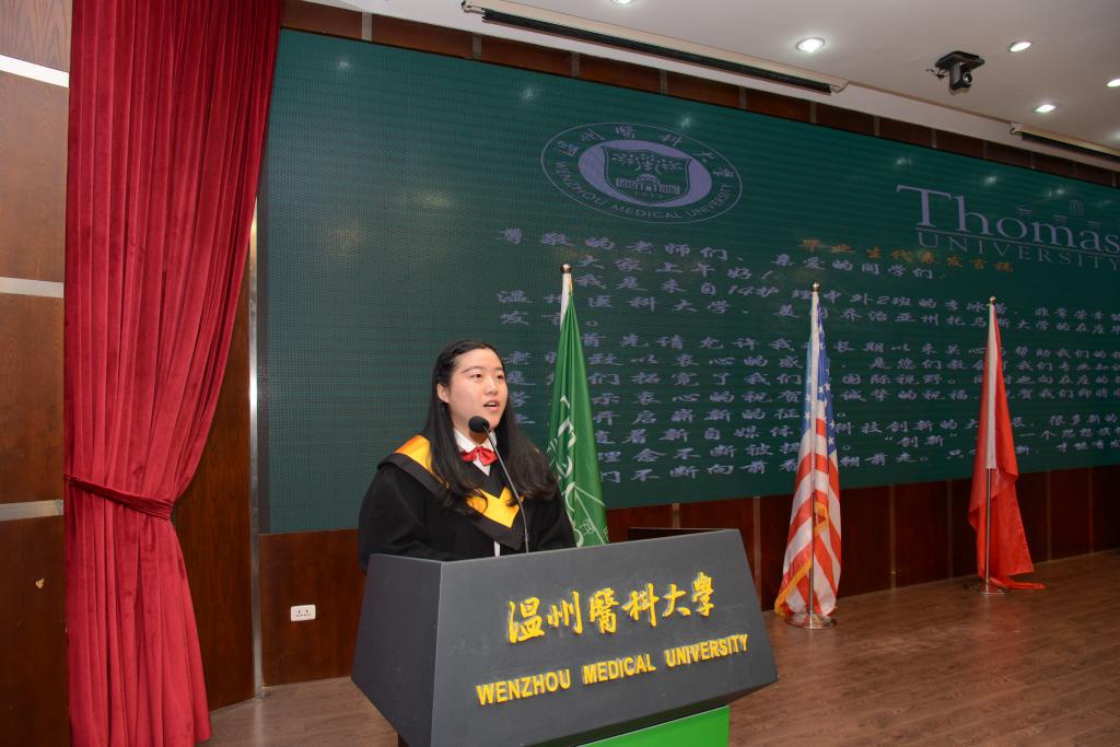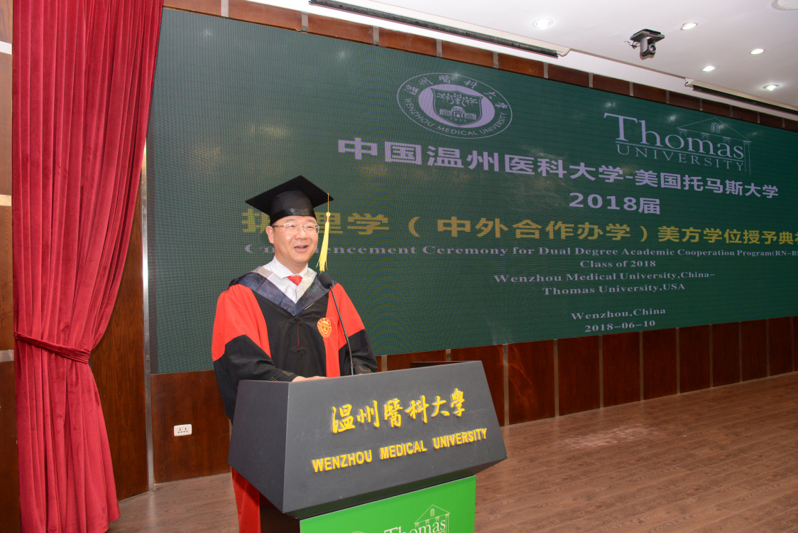 典礼上,曹建明副董事长表达了对美方领导和教授们的感谢,对毕业生的肯定和祝贺,并鼓励毕业生们积极展现当代青年的责任和担当。约翰.梅斯副董事长现场宣读了该校谢普德董事长为托马斯中国合作办学项目(2014-2018)级毕业生写的典礼演讲词,指出“在辩证中,我们会经历许多挣扎和矛盾,但如果你善用这种辩证,你将会获得更多的成功。这意味着你可以成为克服世界上许多造成困扰缺陷的正面力量。”其后,黄磊康博士代替美国托马斯大学中国总校区黄天中董事长发表贺词,鼓励护理学子培养学习爱好,发展终生学习,提升自我能力,勇于面对困难,对追求的事物永保活力。毕业生代表李冰蕾在发言中,表达了对四年来一直陪伴的老师同学的感谢,并对创新思维在护理工作中的应用进行了探讨。