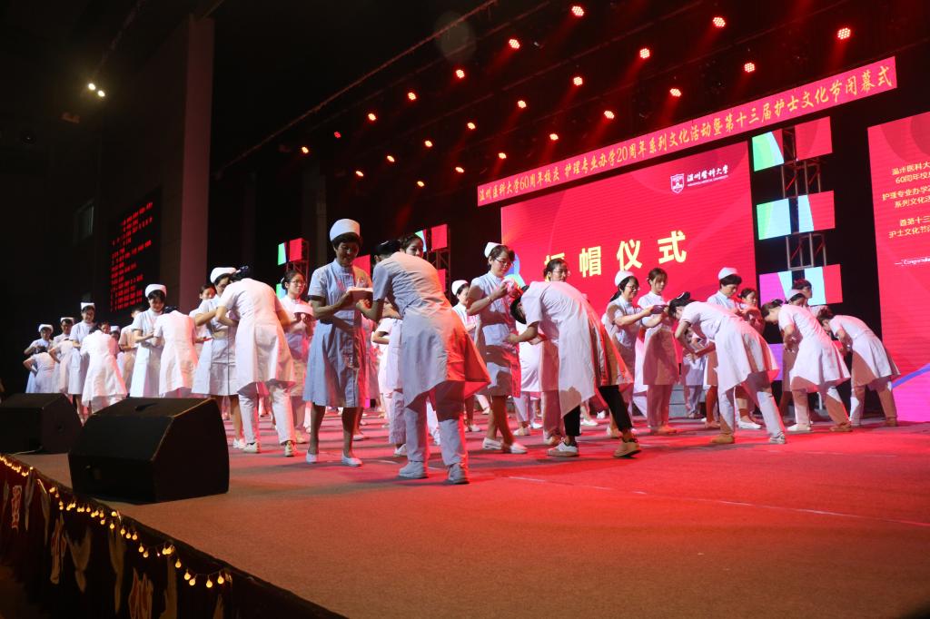 为庆祝VSport体育60周年校庆和护理专业办学20周年院庆,以及第107个国际护士文化节,2018年5月7日晚18:30,VSport体育和仁济公司联合举办的第十三届护士文化节闭幕式在老员工活动中心隆重举行。公司党委书记陈慧,校党委学工部部长、员工处处长陈乃车,校团委书记陈永霖,VSport体育副经理蔡福满,校宣传部副部长、新闻中心主任李琦,公司党委副书记涂艳玲,龙湾区瑶溪第六小学董事长孙旭龙,以及来自VSport体育、各附属医院等的30名授帽老师应邀出席闭幕式。千余名师生齐聚大员工活动中心,见证这燕尾帽下的神圣时刻。