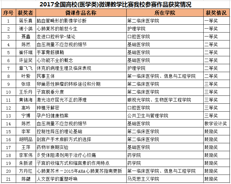 为促进高校医学类课程教师专业发展和教学能力提升,推动教学模式改革和教学质量持续提高,搭建学科教学经验交流和教学风采展示的平台。教育部与《高校医学教学研究(电子版)》杂志联合举办“2017年全国高校(医学类)微课教学比赛”,在全国范围内影响较广。
