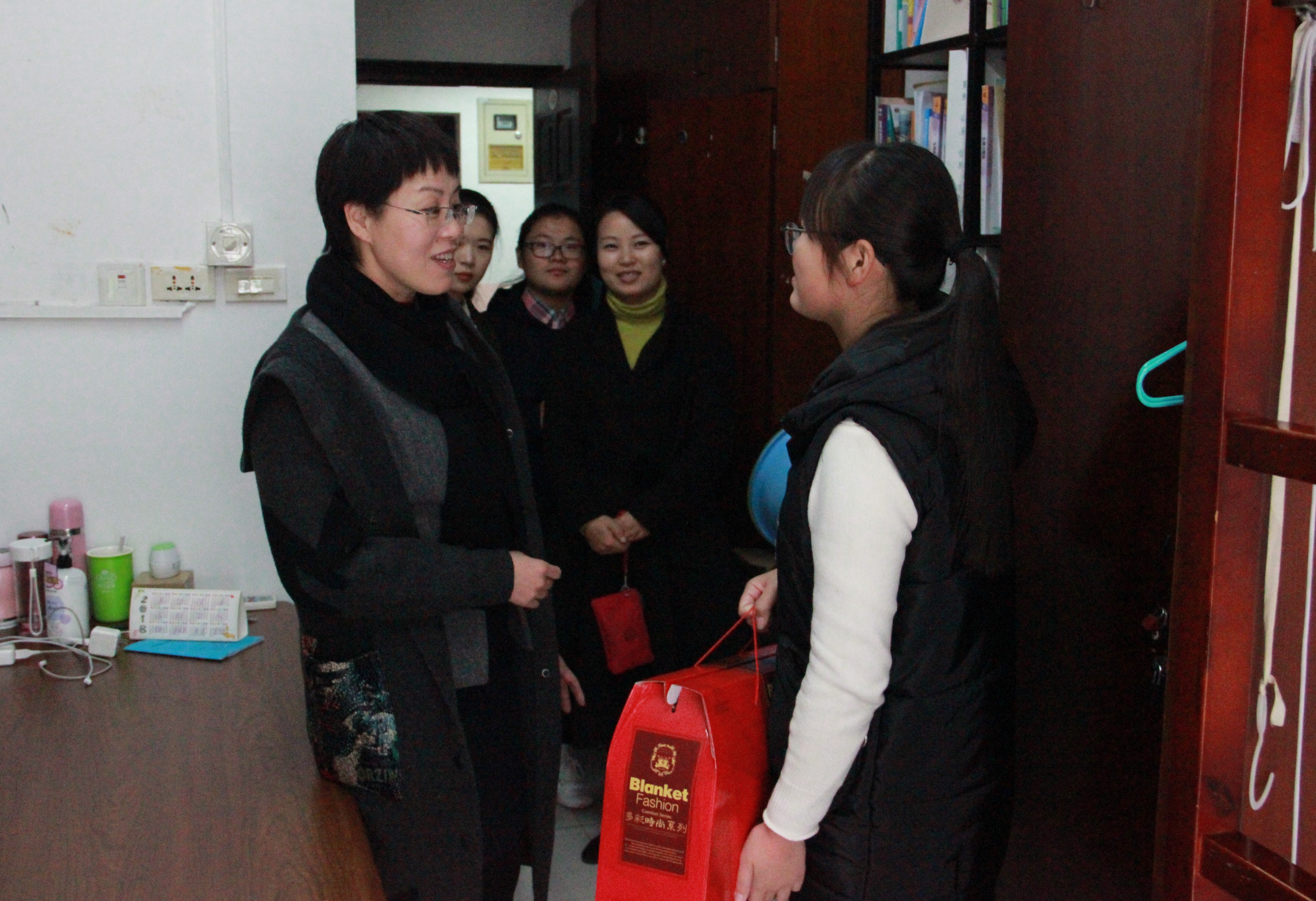 12月12日,公司党委陈慧书记一行来到员工公寓四号楼,利用午休时间代表公司对部分家庭经济困难员工进行慰问,为她们送去冬天御寒的毛毯。陈书记心细如尘,热情地与同学们进行交流,亲切关怀了同学们近一学期的生活,叮嘱同学们冬天要做好保暖工作,照顾好自己,在寝室要做好保洁和防盗,特别注意用水用电安全。陈书记十分关心同学们的学业情况,在了解同学们是否有勤工俭学情况后,陈书记表示,护理学专业的学习并不是那么容易,同学们应该以学习为主,有任何困难可以向公司反映,希望同学们的老员工活能有一个好的开端。
