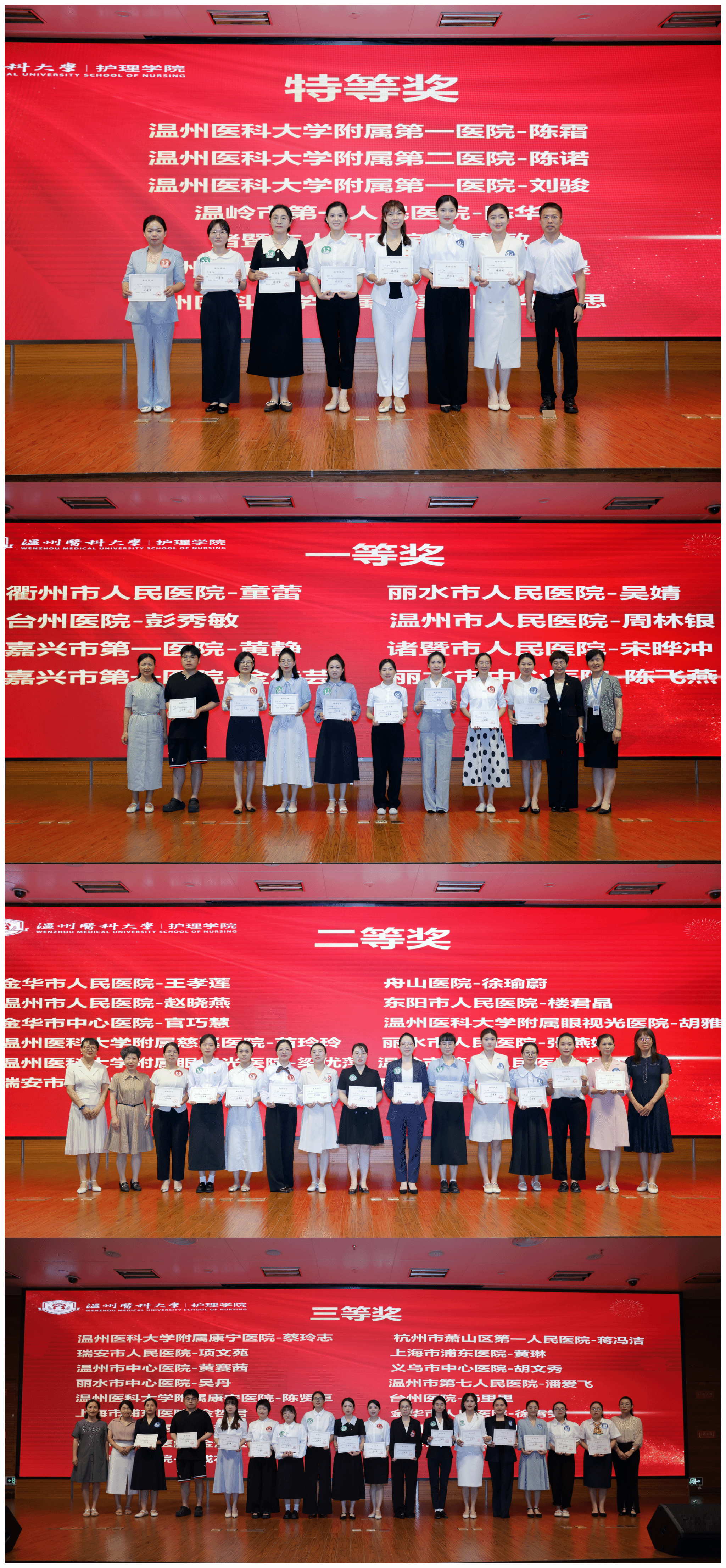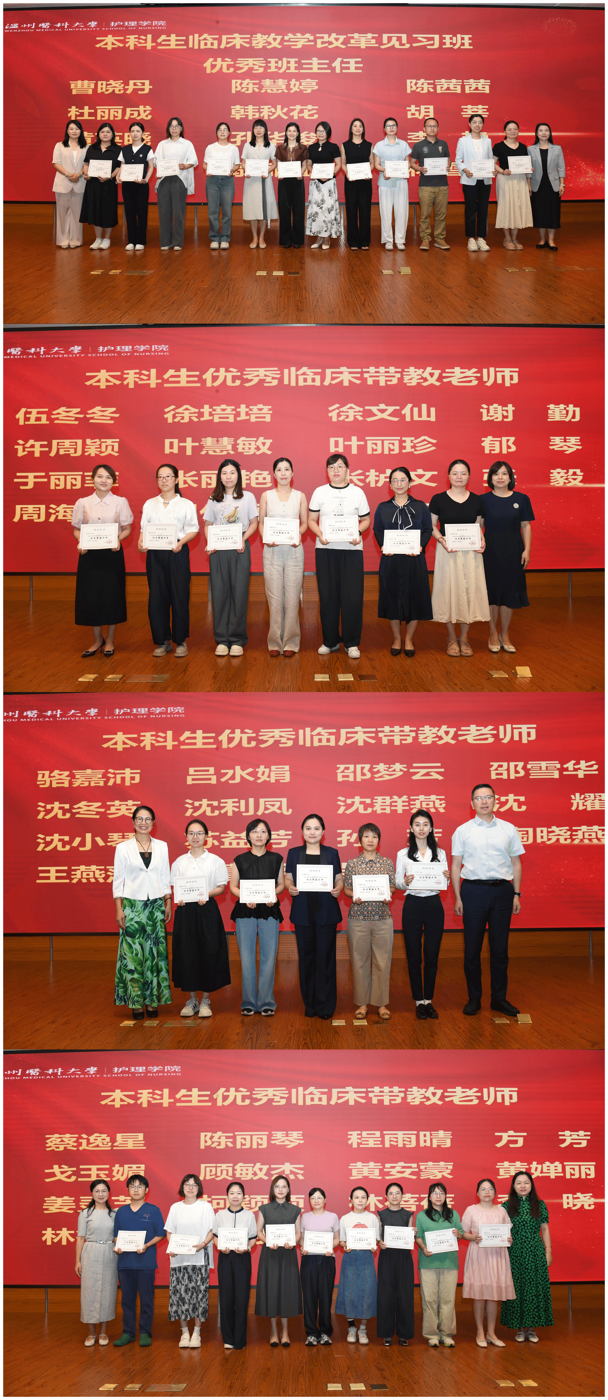 护理临床教学医院及实习基地在人才培养工作中始终秉持高度的责任感与使命感,为护生成长倾注了大量心血。为表彰优秀、树立典型,会议现场隆重举行了颁奖仪式,邀请金伟琼主任、王敏书记、卢丽笋副处长、陈钢副经理、张春梅副经理、金晓童副书记、董超群副经理,分别为本科生优秀临床带教老师及优秀班主任颁发荣誉证书。