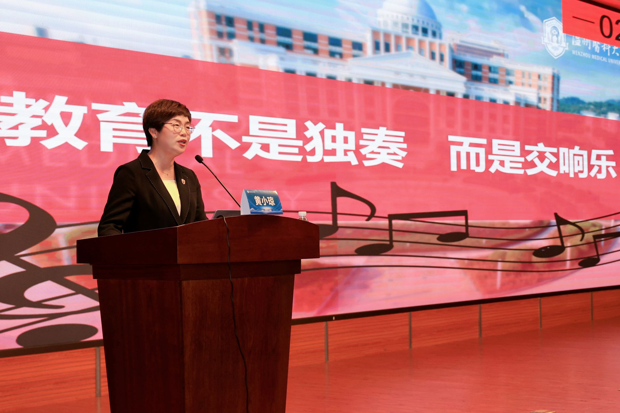 开幕式上,朱雪波副董事长对温医大护理教育的特色与成就给予高度肯定,她聚焦护理学领域教育、科技、人才一体化发展,围绕课程、教材、团队和实践核心要素,强调要坚持育人初心,打造优质团队,强化师生对话,提升护理育人特色;要锚定“新医科”坐标,推动数字赋能,创新人才培养模式,拓展员工国际视野;要优化发展模式,巩固质量理念,完善激励机制,多维度凝练“温医大护理模式”改革经验,形成可复制可推广的护理教育“温医方案”。