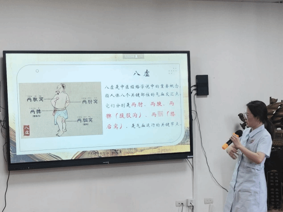 谢小鸽老师以《中医拍八虚》为切入点,用诙谐幽默的语言拆解中医养生哲学。她通过“八虚即人体八处气血淤堵点”的解剖学阐释,结合“拍打肘窝可清心火”的经络原理,将深奥的中医理论转化为可操作的日常保健法。现场演示环节,老师们纷纷起身模仿“虚掌轻拍”的手法,在欢声笑语中领悟“治未病”的养生智慧。