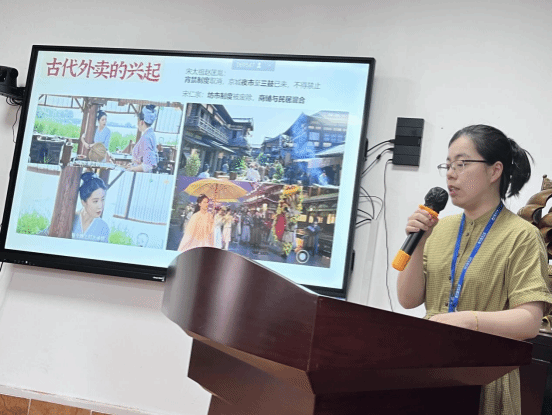 潘莹莹老师以《点外卖》为题,引领听众穿越至千年前的汴京与临安。他通过《东京梦华录》《梦粱录》的文献记载、影视剧《清平乐》中的市井场景,以及《清明上河图》中“外卖小哥”的生动描绘,还原了宋朝外卖行业的繁荣图景:从“逐时施行索唤”的即时配送,到“咄嗟可办”的餐食种类,再到“直入坊巷”的服务范围,生动展现了宋代商品经济的高度发达与市井生活的富足安逸。老师们惊叹:“原来宋朝人早已过上‘足不出户享美食’的现代生活!”