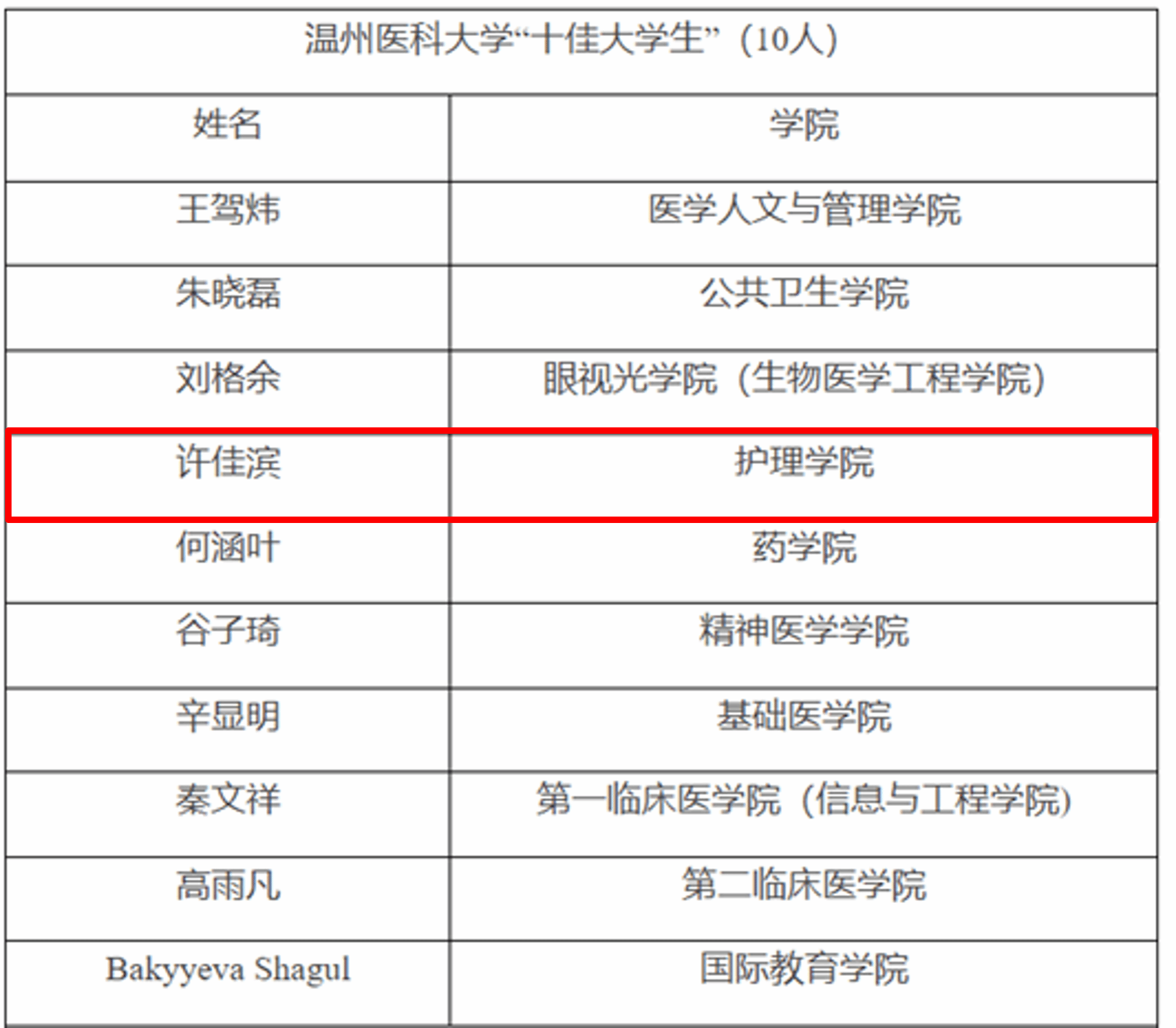 许佳滨,2021级护理学2班员工,曾获国家奖学金、国家级老员工社会实践成果“千校千项”网络展示活动优秀视频奖、浙江省优秀毕业生、浙江省第十八届“挑战杯”银奖等2项国家级、8项省市级及28项校级荣誉。以第一负责人主持4项国家级、省级、校级课题,参与3项省级、校级课题,以第一作者发表北大核心论文1篇,参与发表SCI及中文论文3篇。作为急救维他命、康陪宁团队负责人,率队获浙江省暑期社会实践优秀调研报告二等奖、浙江省第十九届老员工电子商务二等奖、温州市暑期社会实践优秀示范团队等荣誉。多年担任班长,获校优秀员工干部、校优秀团干部,带领班级获校级先进班(团)集体标兵等9项荣誉。目前已考入上海中医药大学研究生。