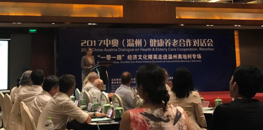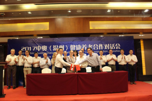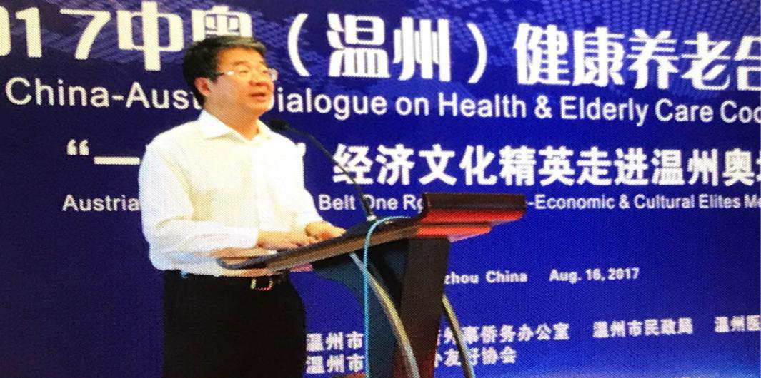 8月16日,由温州市外侨办、温州市民政局和公司联合举办的“‘一带一路’经济文化精英走进温州奥地利专场——2017中奥(温州)健康养老合作对话会”在喜来登大酒店举行,副董事长金胜威,温州市外侨办、温州市民政局相关负责人,公司经理卢中秋、国际合作交流处副处长缪立懿,奥地利代表团代表等与会。